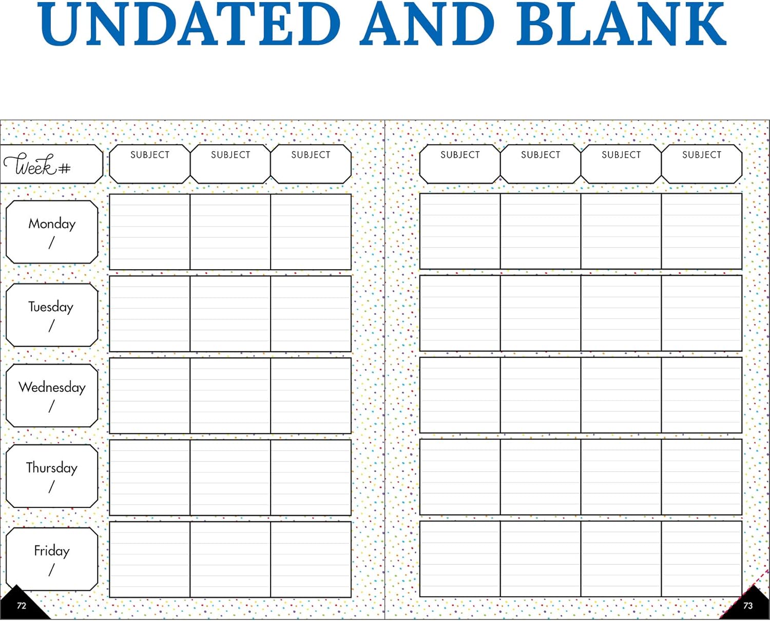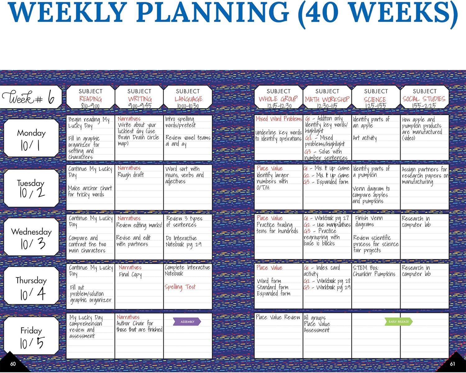 - SUPERIOR ORGANIZATION: Perfect for homeschool lessons and classroom planning, the sparkly teacher planner includes a horizontal layout with sections for up to seven academic subjects. Each section is lined for neatly organizing each component of the lesson and allowing you to add notes for future reference. The first section of the two-page weekly spread is a date block with plenty of space to record important reminders for parent and committee meetings, professional development and specials schedules.