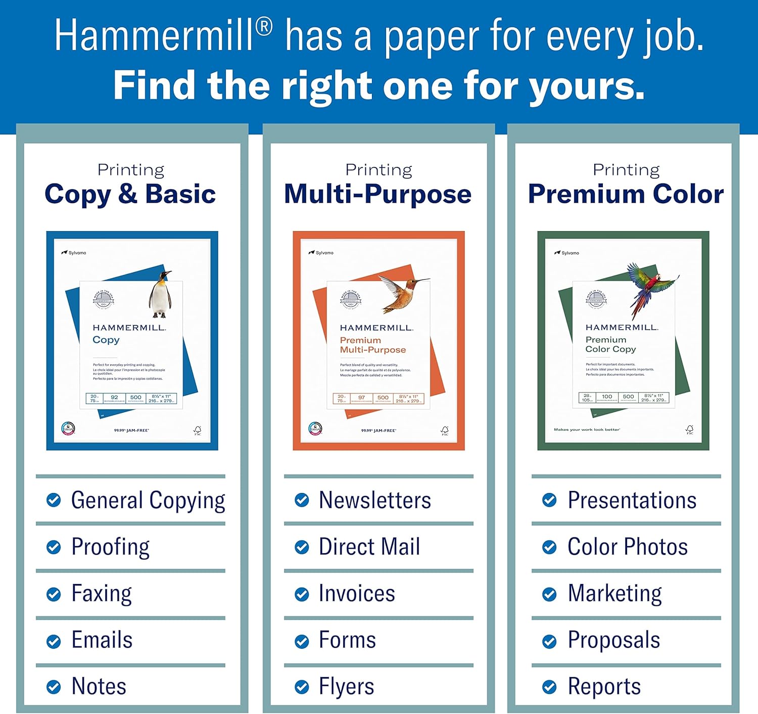 - PREMIUM COLOR COPY PAPER – Hammermill Premium Color Copy 32lb Paper provides a high-tech sheet that’s designed to show your work at its best so you can confidently use it for design proposals, full-color presentations, photographs, brochures and more.
