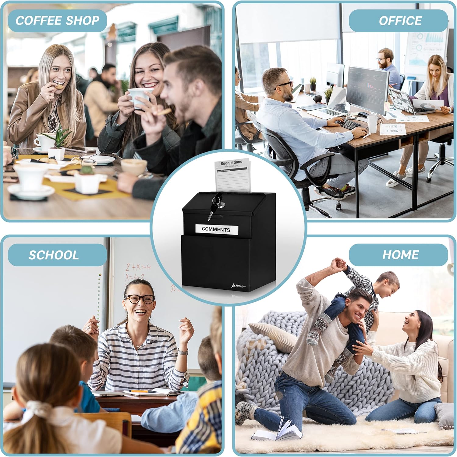 - Get More Bang for Your Buck: AdirOffice wall mount donation boxes for fundraising and charity comes with 25 Suggestion Forms / Cards, Stick-on labels, 2 Locking Keys for added security