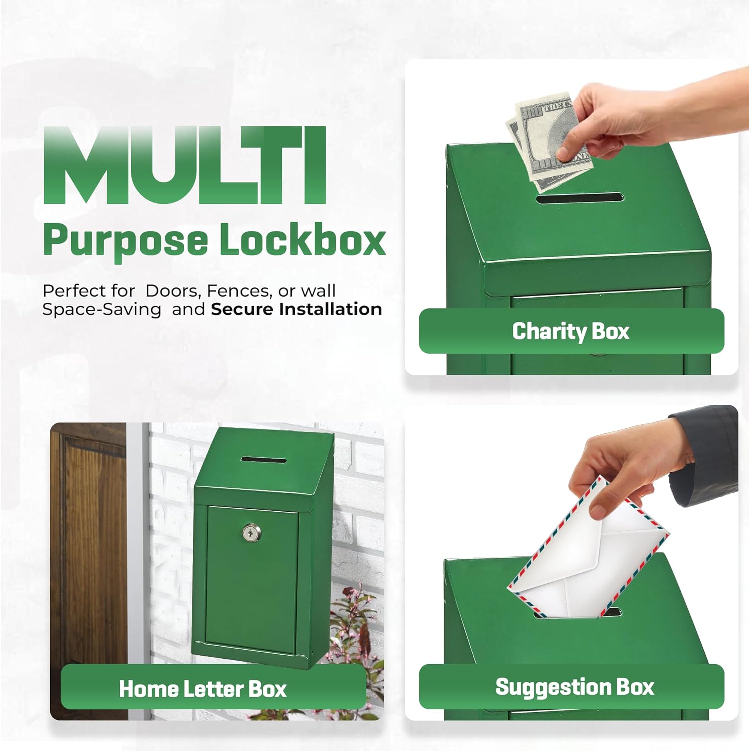 Metal Donation Box-Suggestion Box with Slot and lock-Cash Lock box for Money-Secure Drop Box-Comment and ballot voting box-comes with pre-drilled holes for easy wall mounting 10 X 6 X 2.5"(Green)