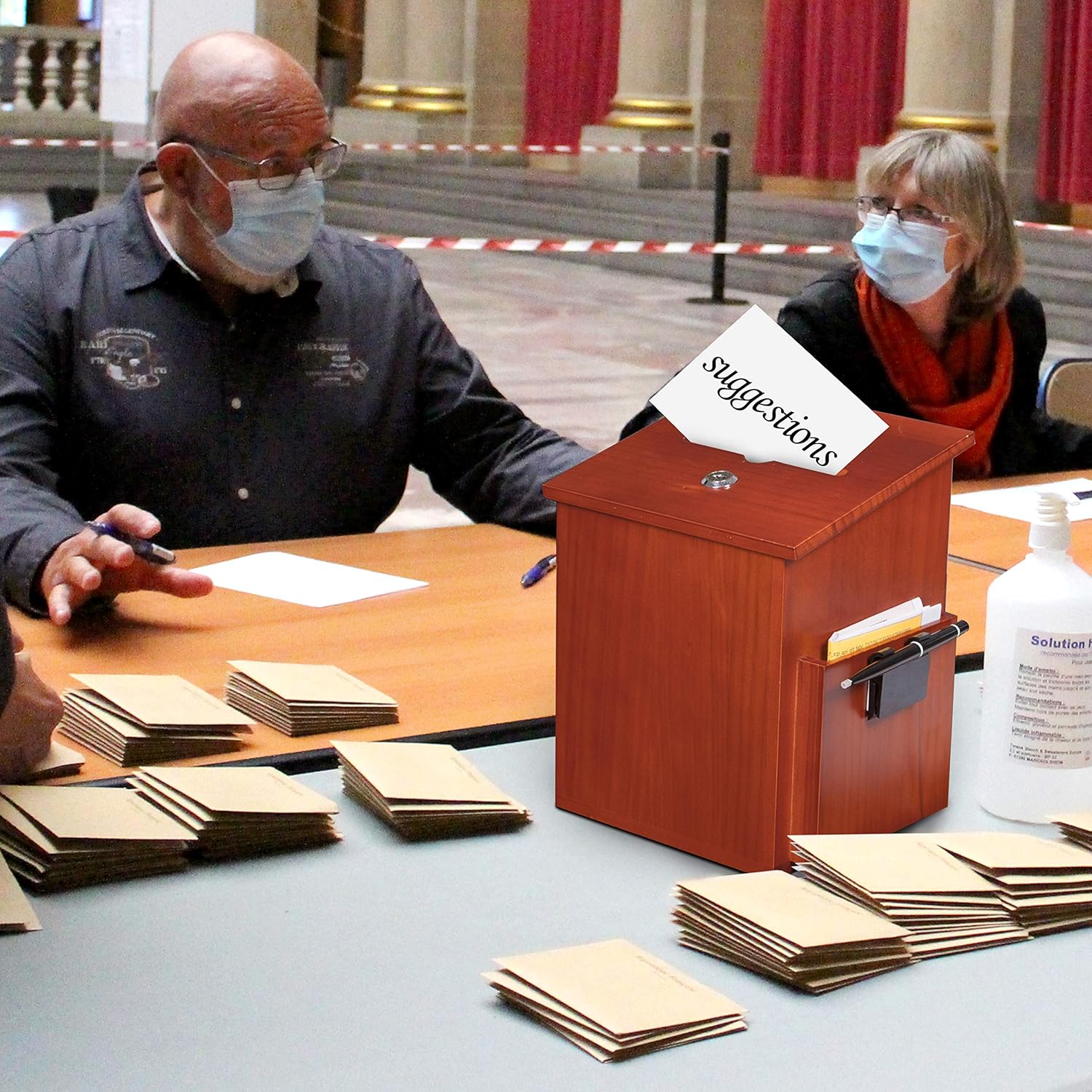 Wood Charity Donation collection Box Office suggestion Ballot Box With wide slot for envelopes and suggestion comment forms, side Pocket and Locking Hinged Lid & Pen for Table Or Counter-top(Mahogany)