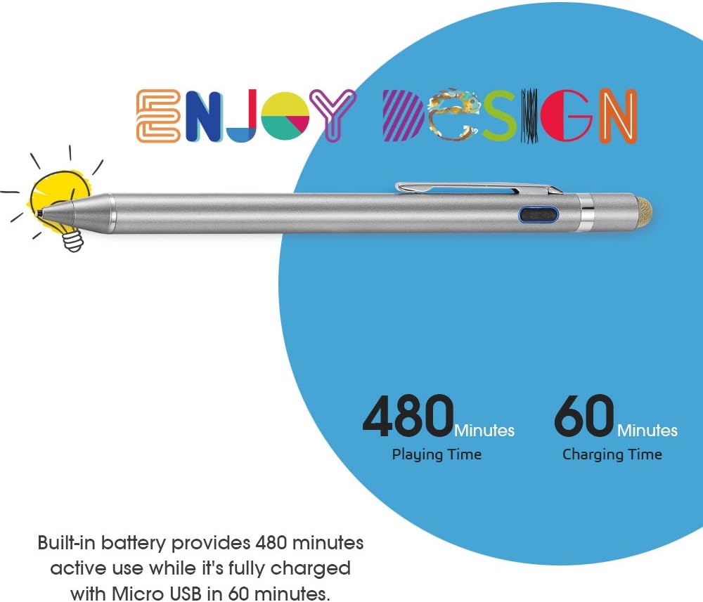 - ăGreat FeatureăBuilt-in battery stylus for ipad iphone samsung and more touchscreens provides 8 hours active use while it's fully charged with Micro USB in 60 minutes.Smart Saver,auto shutdown after 30 mintues power on for safety. When battery is running off, the stylus still works in another side, just switch it to the fabric cap which is also sensitive.