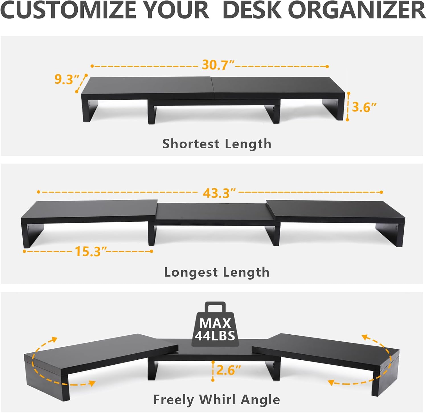 - CUSTOMIZE YOUR OWN DESK ORGANIZER: Our desk monitor stand has adjustable length (30.7-43.3 inch) and angle, especially, the ability to change the angles of the end pieces. The desktop monitor stand can easily be moved adjusted to suit the curve of your monitors and fit smaller or larger desks!
