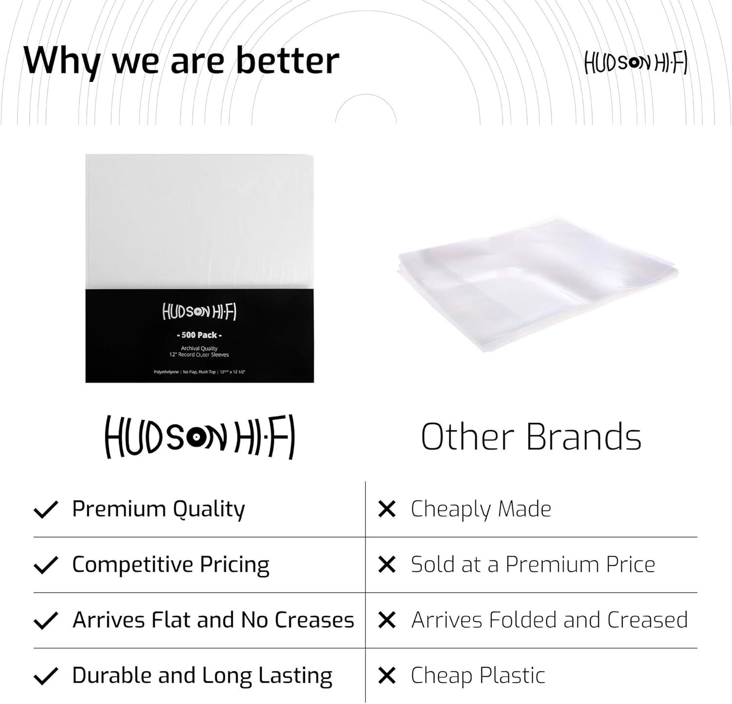 Hudson Hi-Fi Vinyl Record Outer Sleeves Covers - Premium Clear Vinyl Record Sleeve 100-Pack - Protect Your LP Albums from Scratches, Dirt & Dust - 3mm Thick No-Acid Exterior Disc Cover