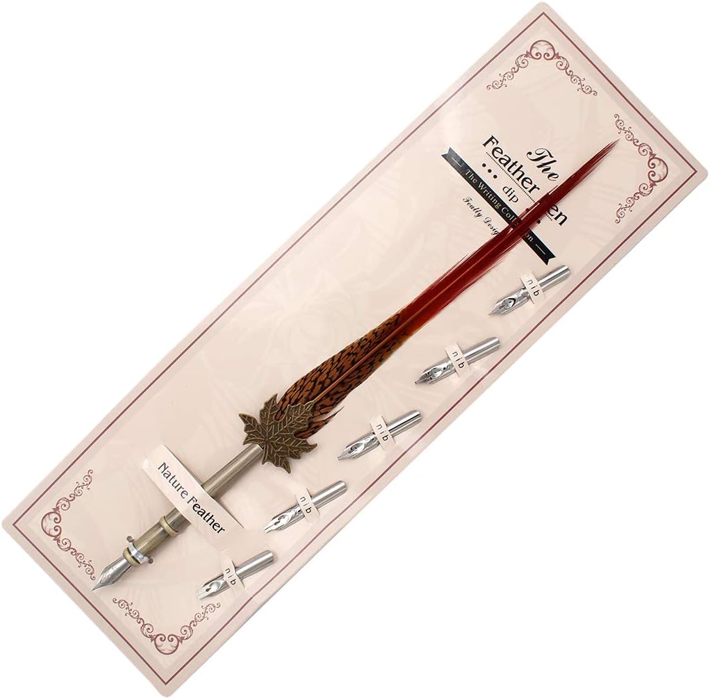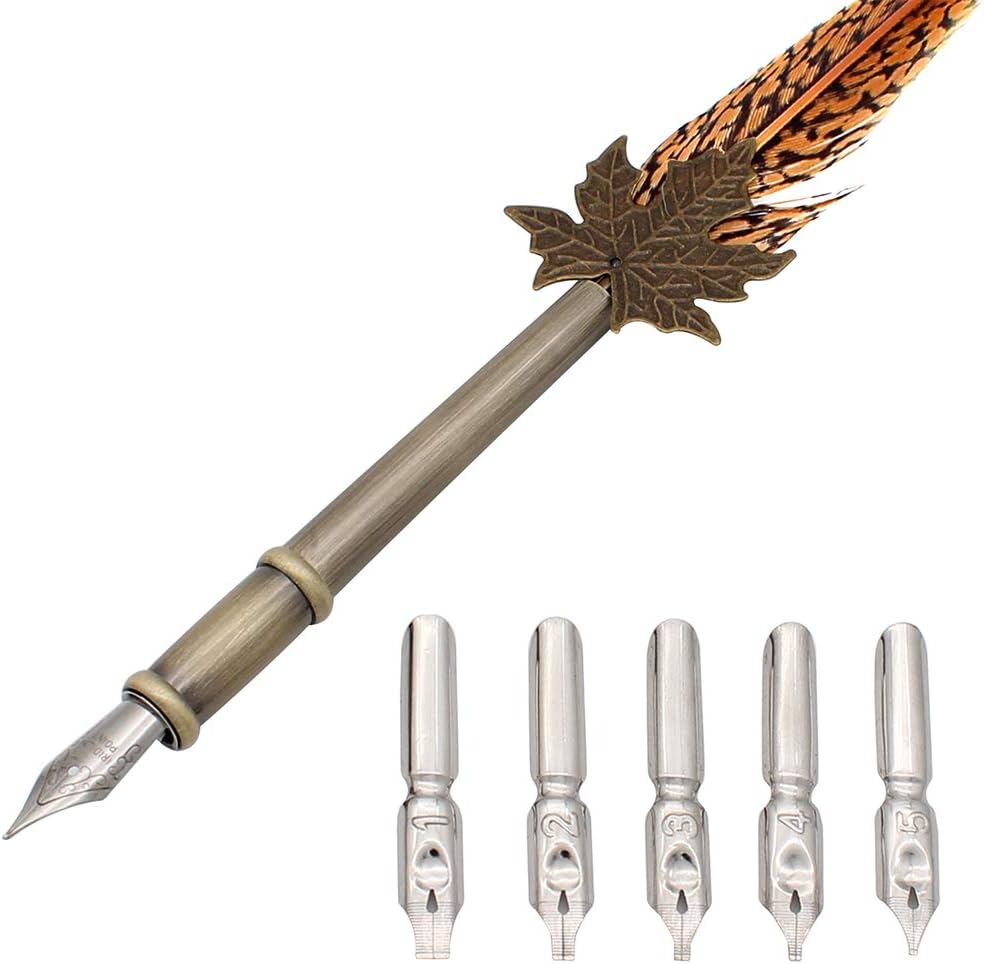 Gullor Quill Handcraft Feather Dip Pen Stem Metal Nib Pen Writing Quill with 5 Extra Nibs, Style A
