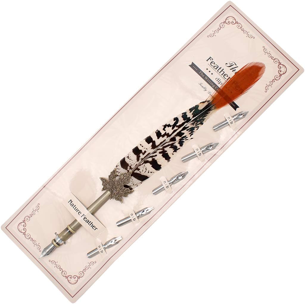 Gullor Quill Handcraft Feather Dip Pen Stem Metal Nib Pen Writing Quill with 5 Extra Nibs, Style B