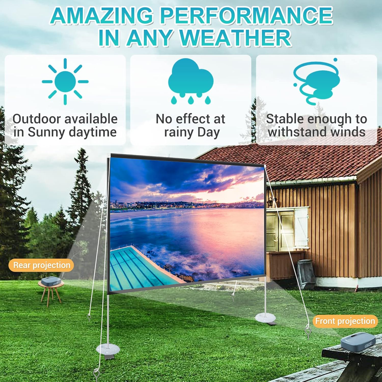- 【Wrinkle Free Outdoor Movie Screen】With 100-inch Diagonal, 160° Wide Viewing Angle, Gain 1.1 and 16:9 aspect ratio, 100inch outdoor projector screen with stand has made of high-quality polyester & spandex material , thicker than other average screens. Projector screen with stand greatly offers sharper and brighter image quality. Screen has soft and smooth touch feeling,which make you more pleasure,not easy to be yellow, Meanwhile, supporting front and rear projection.