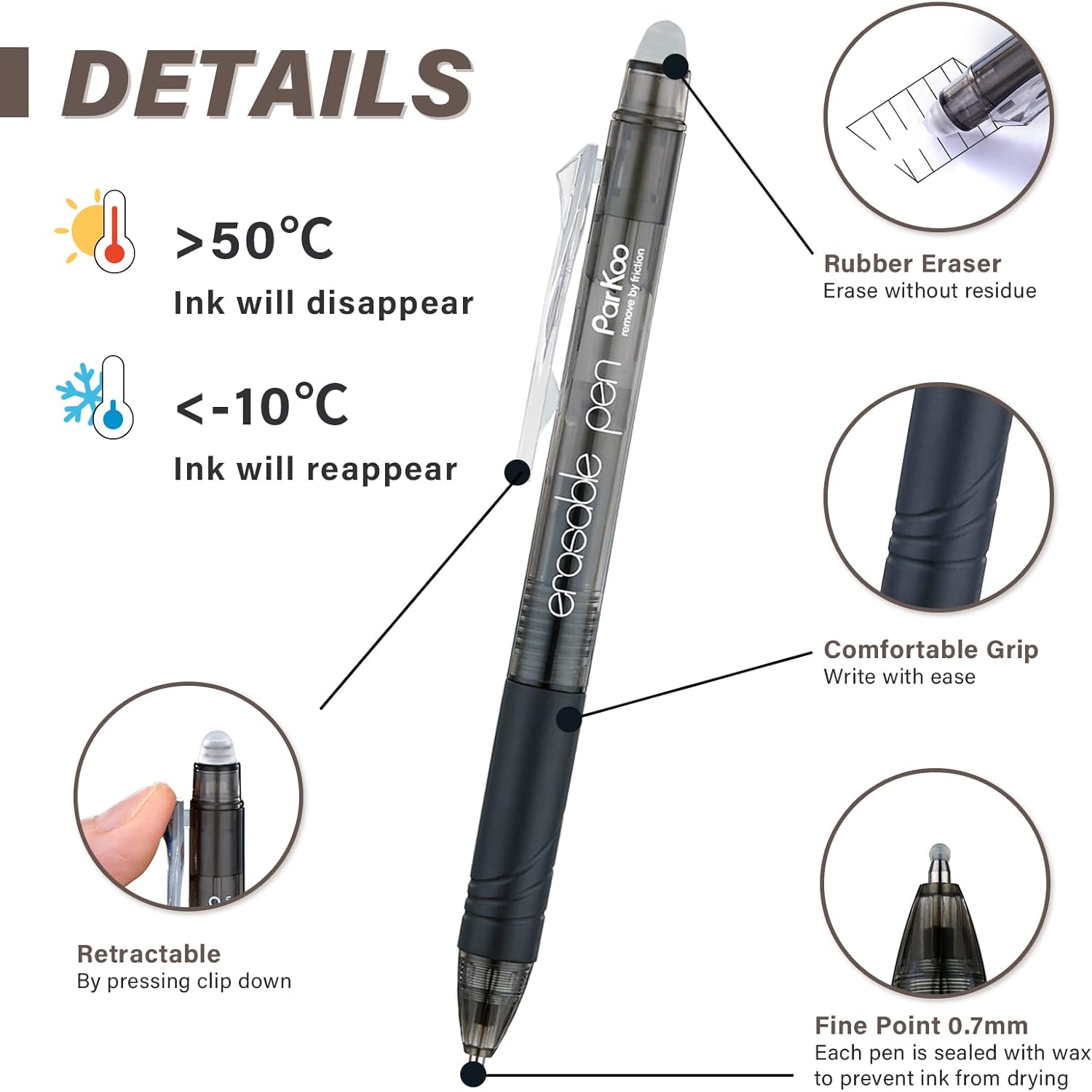 - 2 Colors, Retractable Design: 6 black, 6 blue, with 0.7 mm fine point tip; Smooth writing gel ink: nontoxic, acid-free, non-bleeding, heat erasable; Eraser is on the top of the pen; the pen is retractable by pressing the side clip down