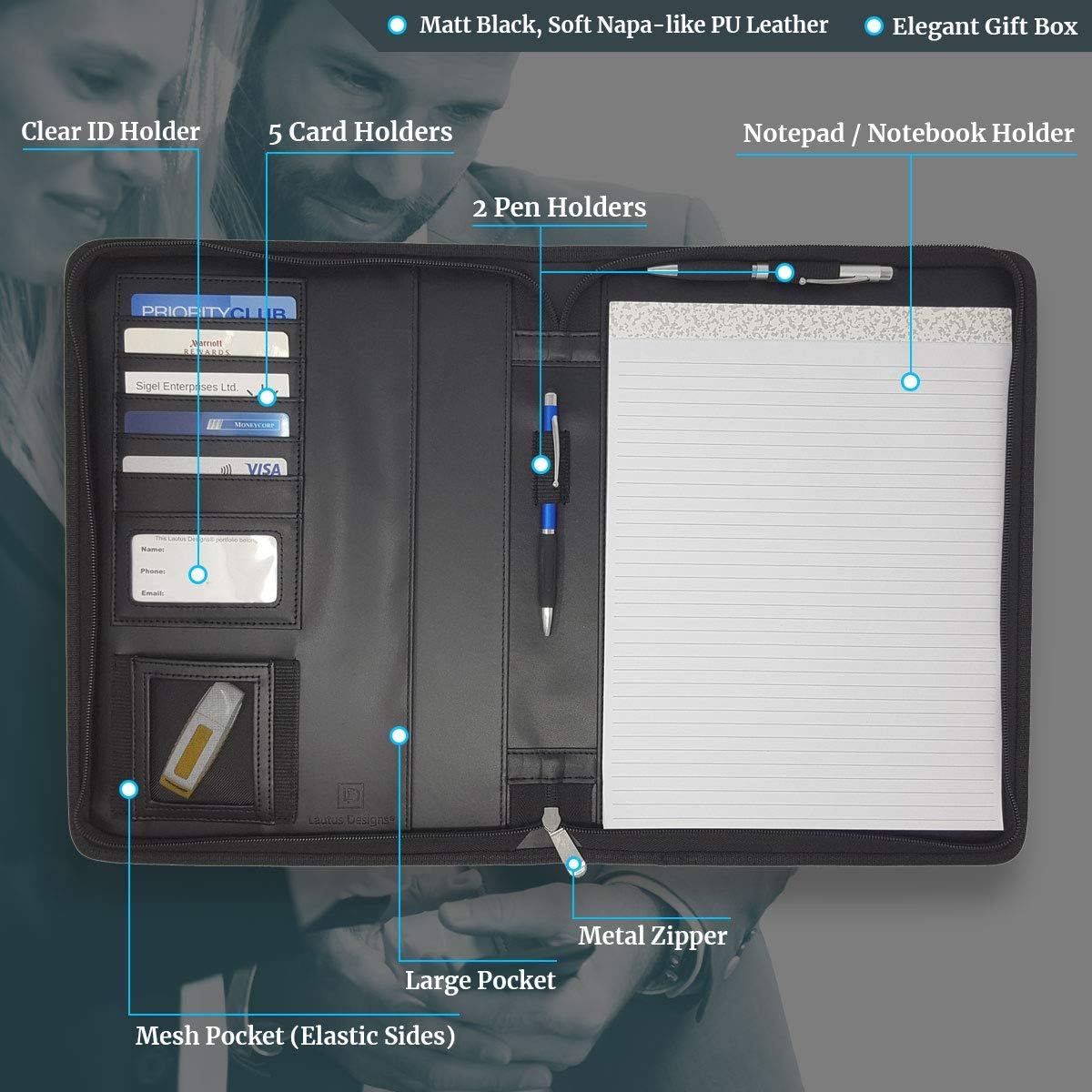 - PERFECTLY ORGANIZED: Ideal accessory for the home office, corporate office or an interview! Organize & carry your resume, loose papers, 2 pens, credit / business cards, ID & more in our Lean faux black leather portfolio folder for men or for women.