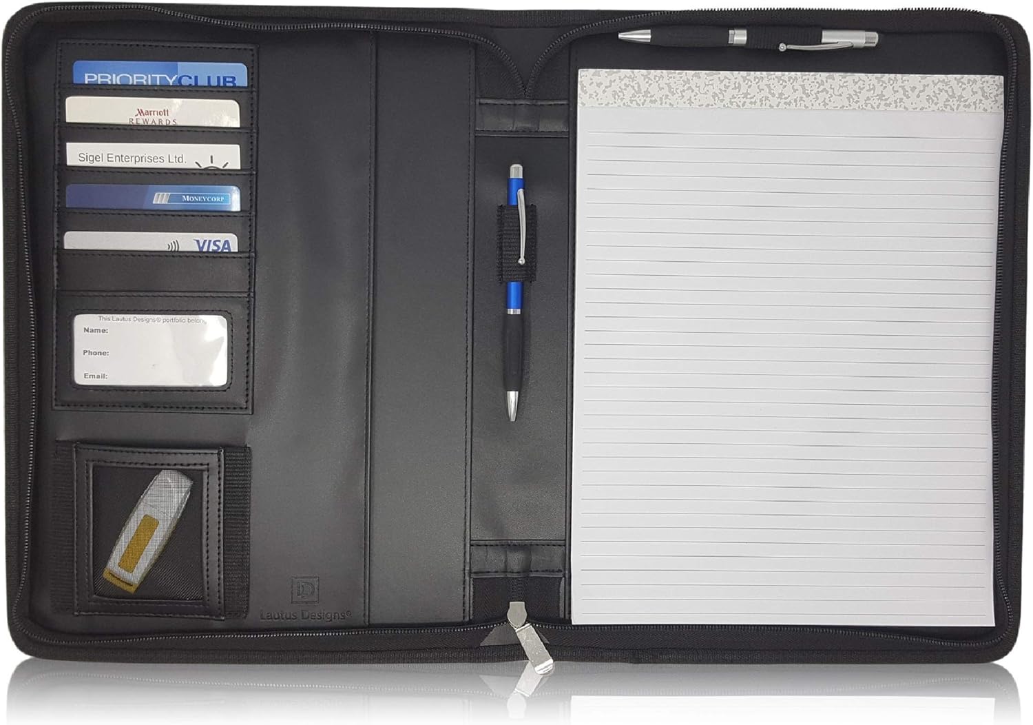 - VERSATILE: The zippered padfolio holds any US Letter (8.5 x 11") notepad or notebook that opens to the left or up & 2 pens safely in the wraparound zippered closure.