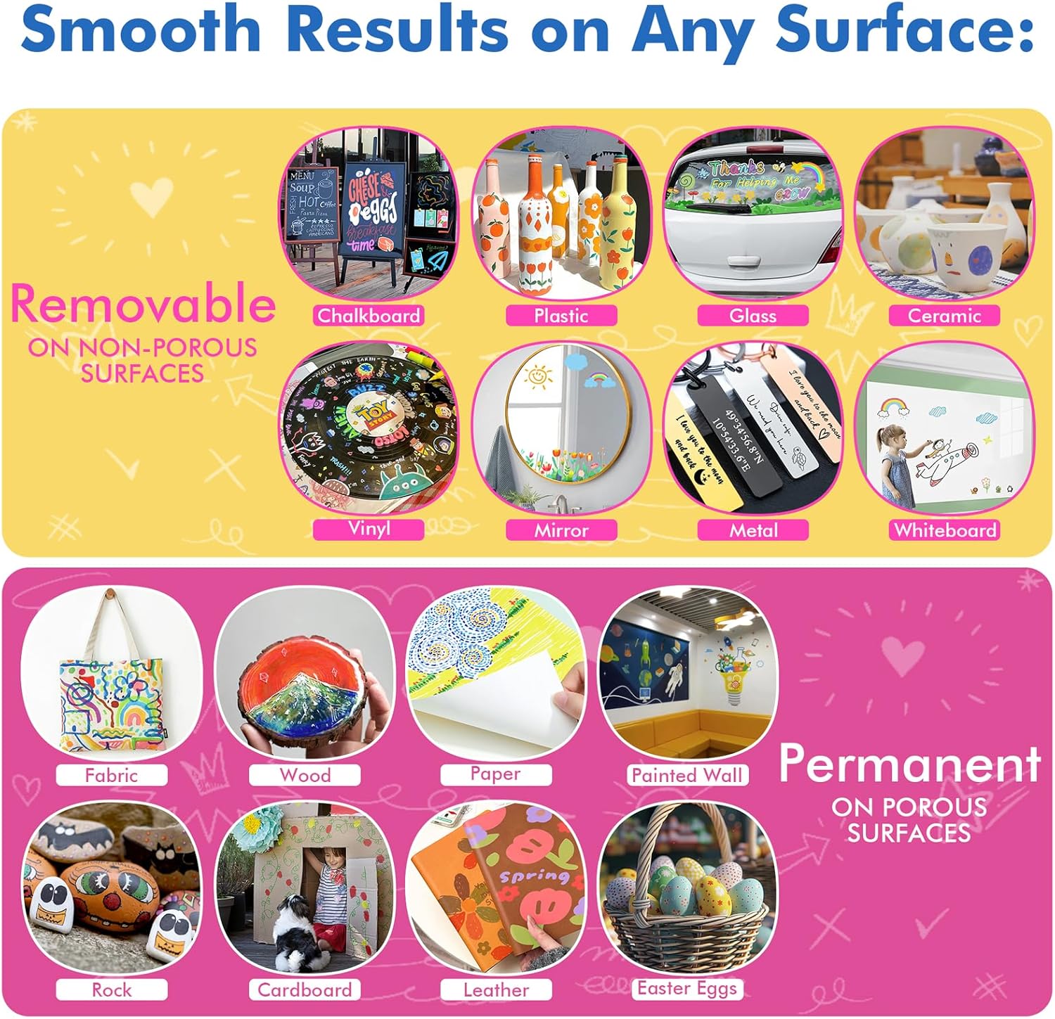 - PLEASE NOTE - Our chalk markers work perfectly with bright and vivid colors on ALL non-porous surfaces. it's recommended to try them first on small areas and always follow the cleaning instructions provided.NOT ALL CHALKBOARDS ARE SUITABLE FOR THE USE OF CHALK MARKERS. PLEASE TRY THE MARKERS ON SMALL AREAS FIRST TO AVOID RUINING YOUR BOARD.
