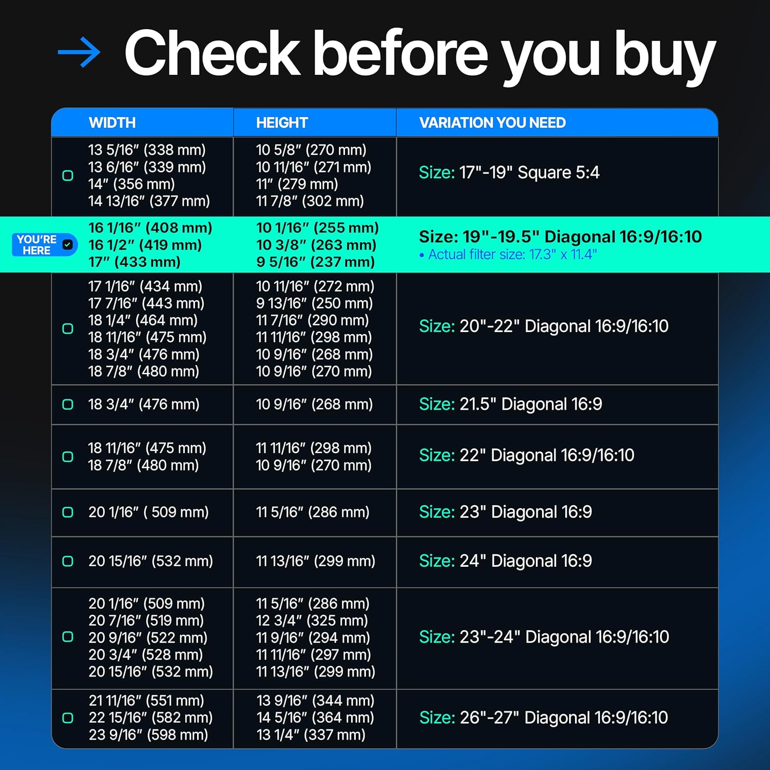 - Ideal Fit: Privacy screen protector fits screens sizes of 19", 19.5". Actual filter size: Width: 17.3 inches (440mm), Height: 11.4 inches (290mm). The filter enhances visual clarity and protects the eyes