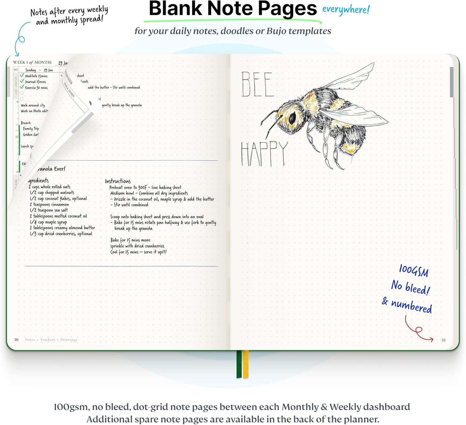 - Satisfying Writing: High performance planner with stitch-bound lay-flat pages. Sturdy PU leather planner hard & softcover options. 100GSM no-bleed, no-smudge paper. 2 ribbon bookmarks, elastic closure, back pocket and smoothly rounded edges.