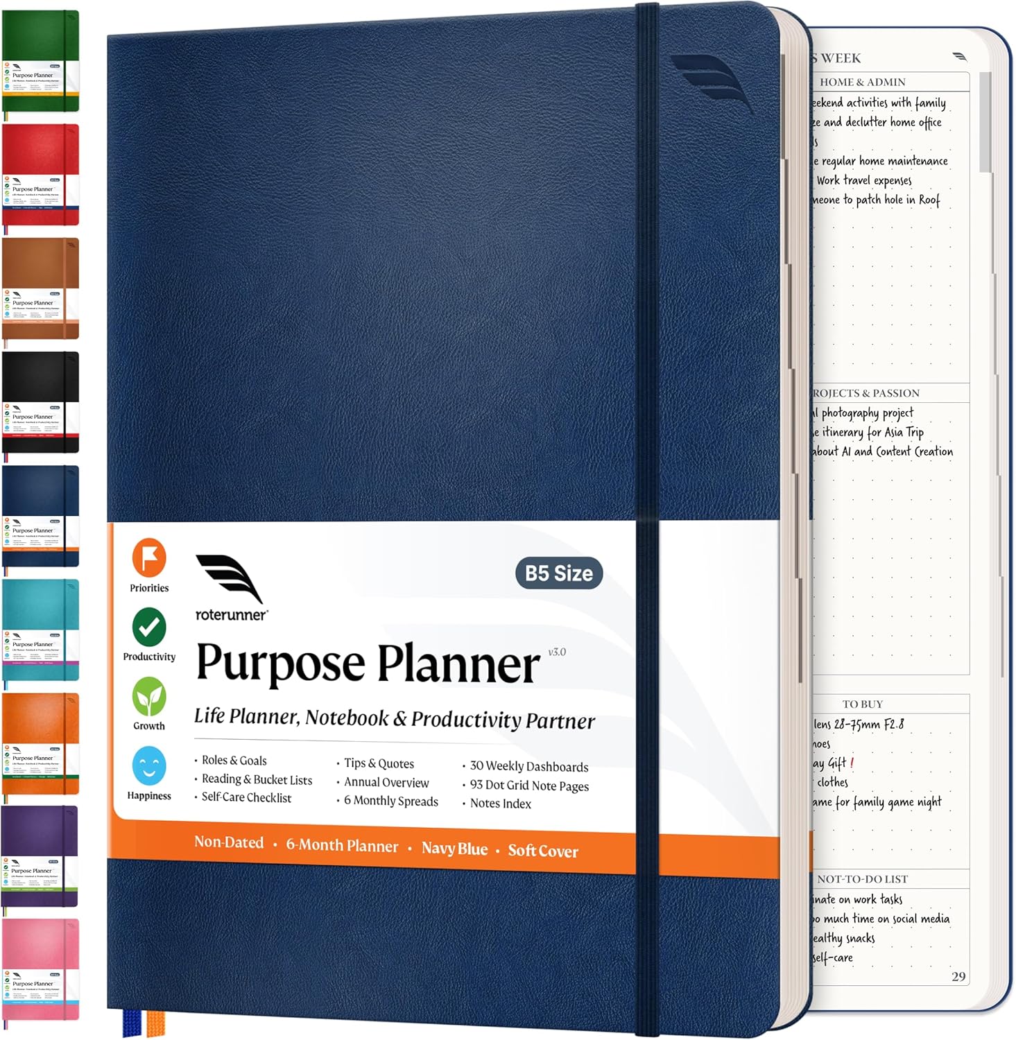 Roterunner Purpose Planner Notebook B5 7.5”x9.8” Undated Planner 2025 Daily Weekly and Monthly Productivity Goal Setting Tool for Work Home