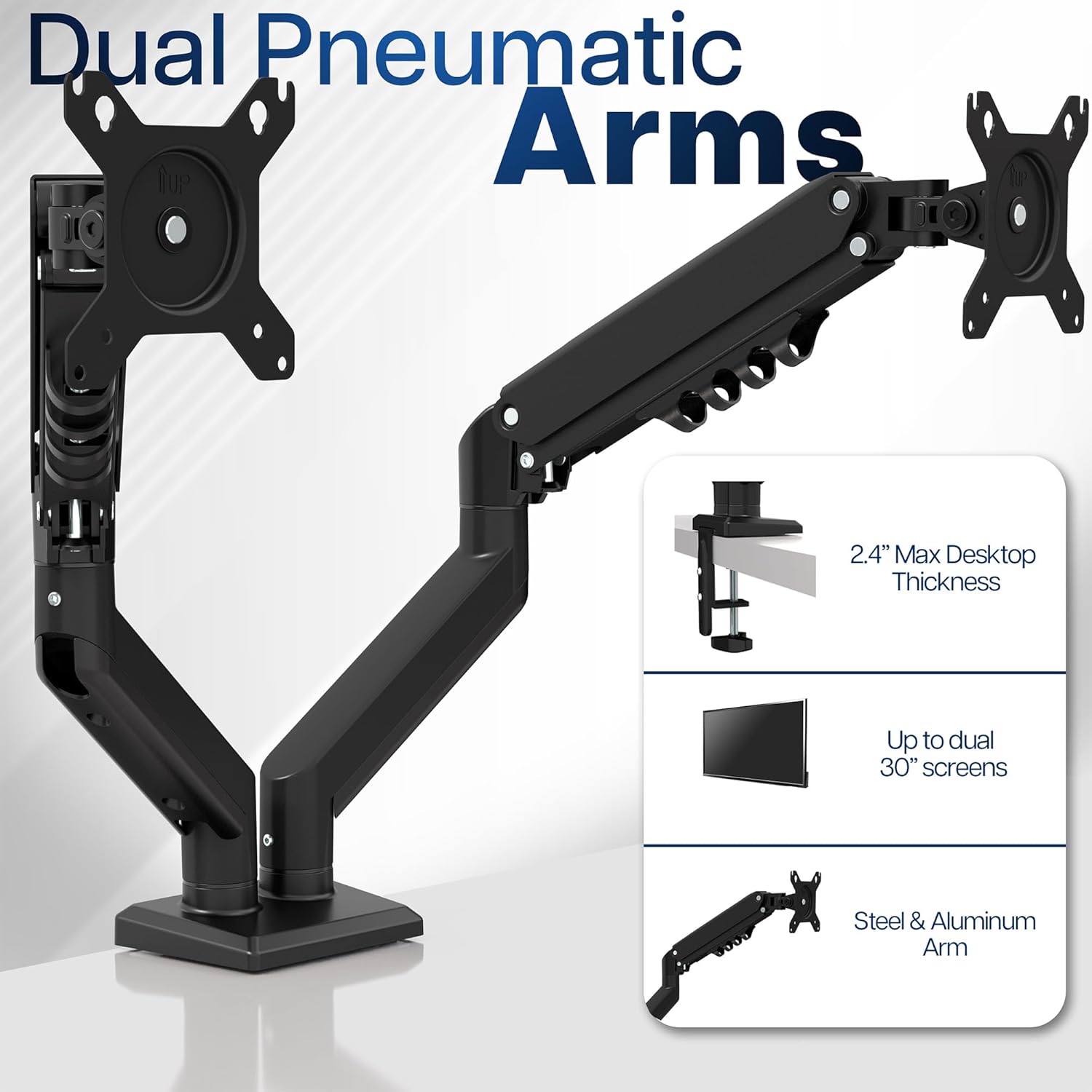 - Fits Standard Size Screens: Dual mount for monitors 13” to 30” in size and up to 19.8 lbs in weight (each) with 75x75mm or 100x100mm VESA patterns. Secures to desks up to 2.4" thick with heavy-duty C-clamp or optional grommet mount