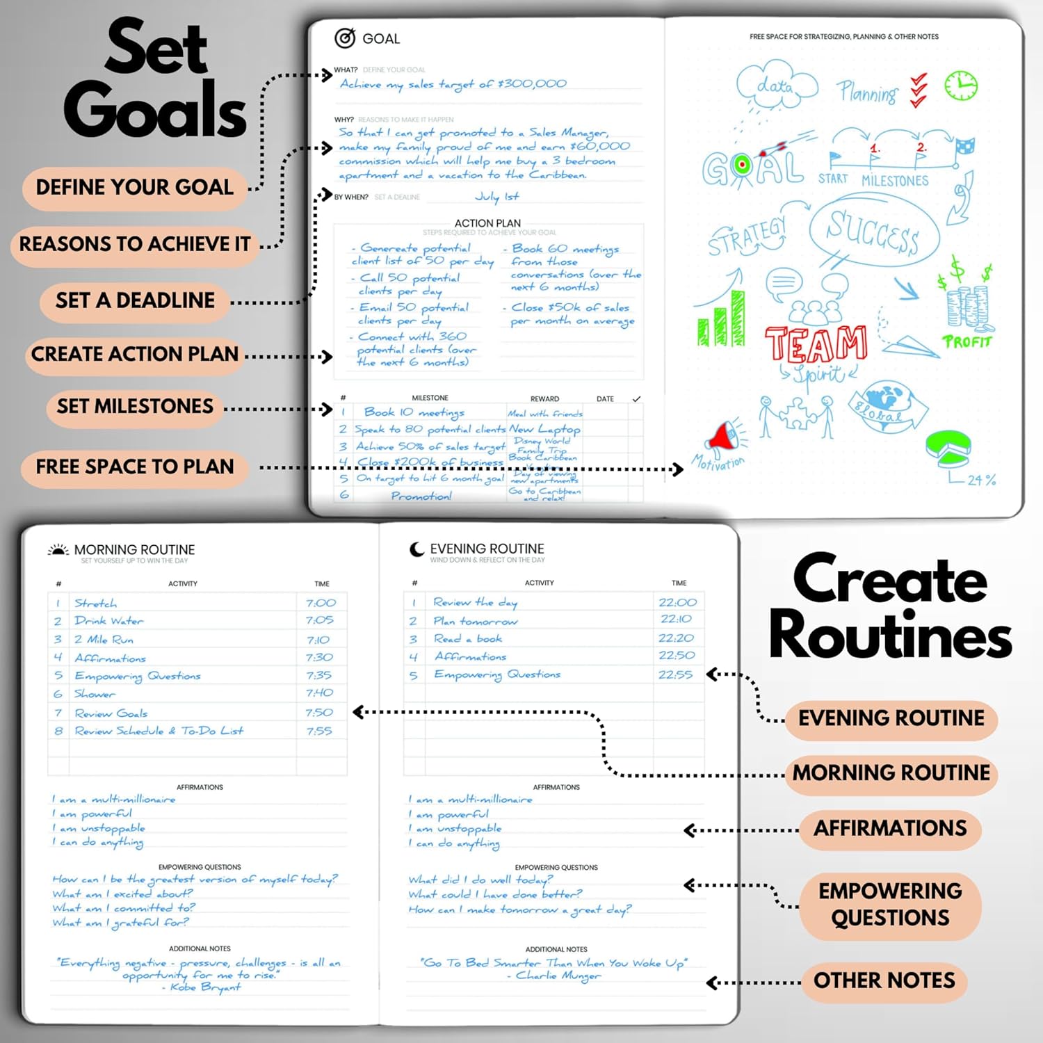 - STAY ALIGNED WITH YOUR GOALS – Use built-in goal-setting tools and review prompts to stay focused on long-term success—whether you’re managing business milestones, career growth, or personal development.