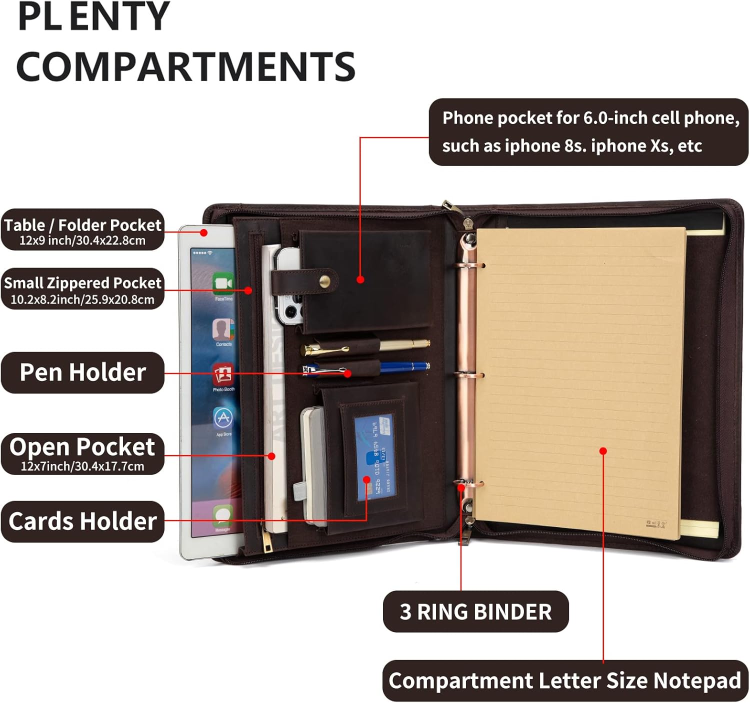 Professional Leather Business Padfolio Portfolio Case, 3 Ring Binder,Zippered Business Document Organizer Tablet Holder Folder Case,with Letter Size Notepad (Dark Brown)