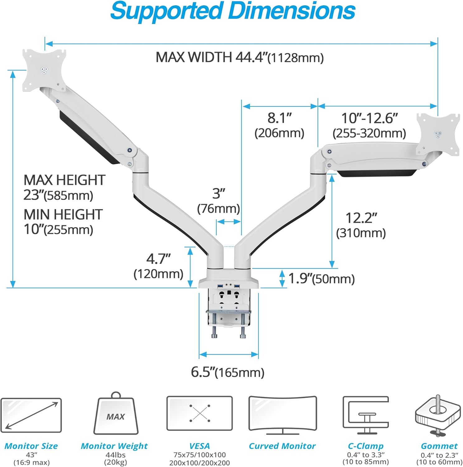 - FITS 13" TO 43" SCREEN - Dual monitor desk mount fits most of flat/curved/ultrawide computer monitors up to 44lbs (20kg) each in weight with VESA 75x75mm / 100x100mm / 200x100mm / 200x200mm mounting holes.