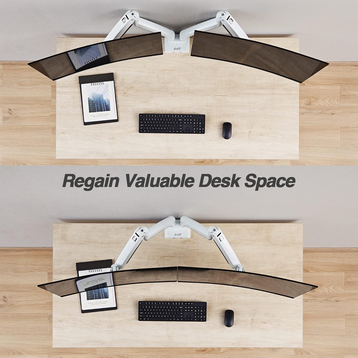 AVLT Dual 13"-43" Monitor Arm - Desk Mount for Two Flat/Curved Monitors - Full Motion Height Swivel Tilt Rotation Adjustable - White/VESA/C-Clamp/Grommet/Cable Management