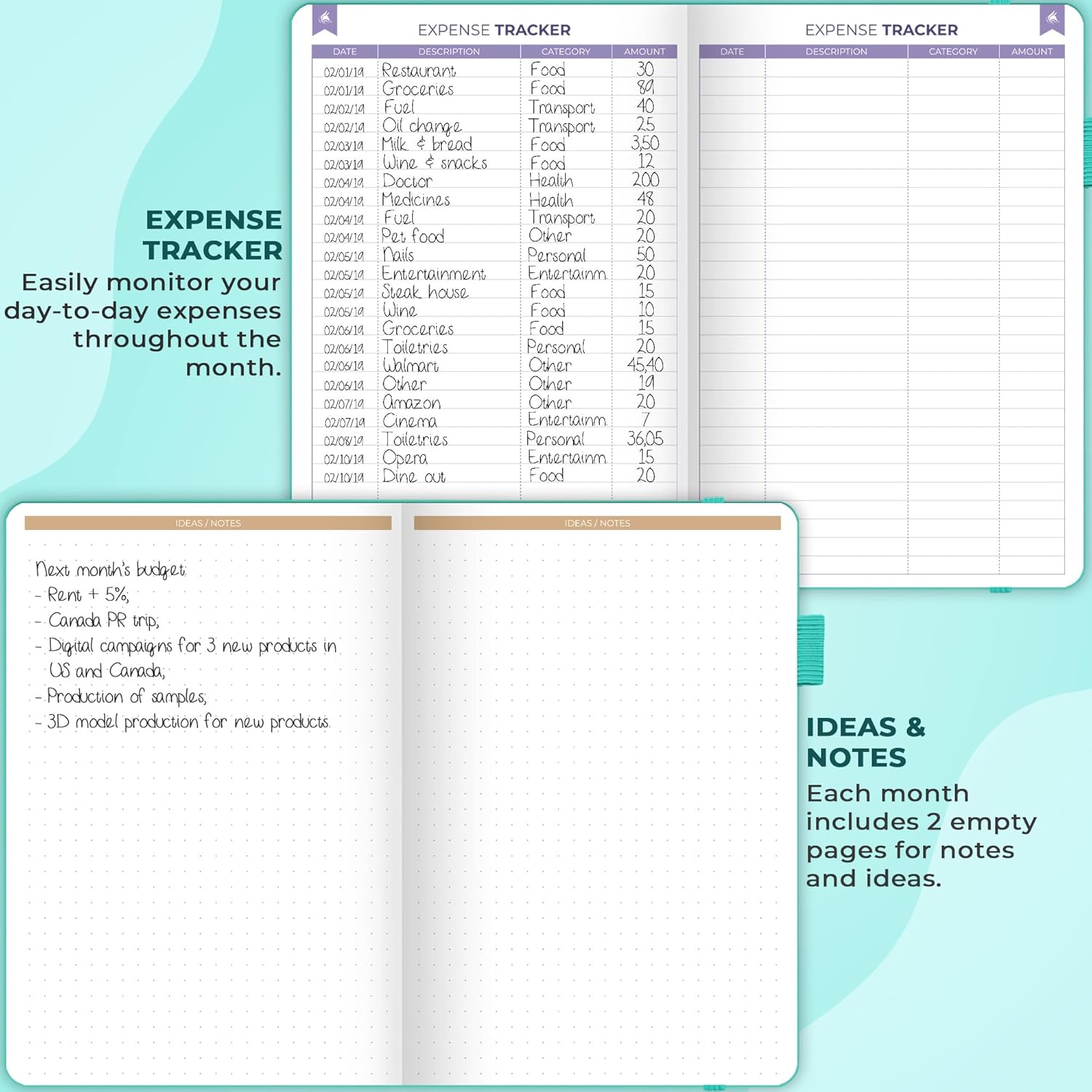 - PLAN & MONITOR YOUR FINANCES – Each month, make a monthly budget, set goals, plan bills and purchases, and manage monthly payments. Use a dedicated expense tracker to track your day-to-day spending. There are also 2 dotted pages per month for notes.