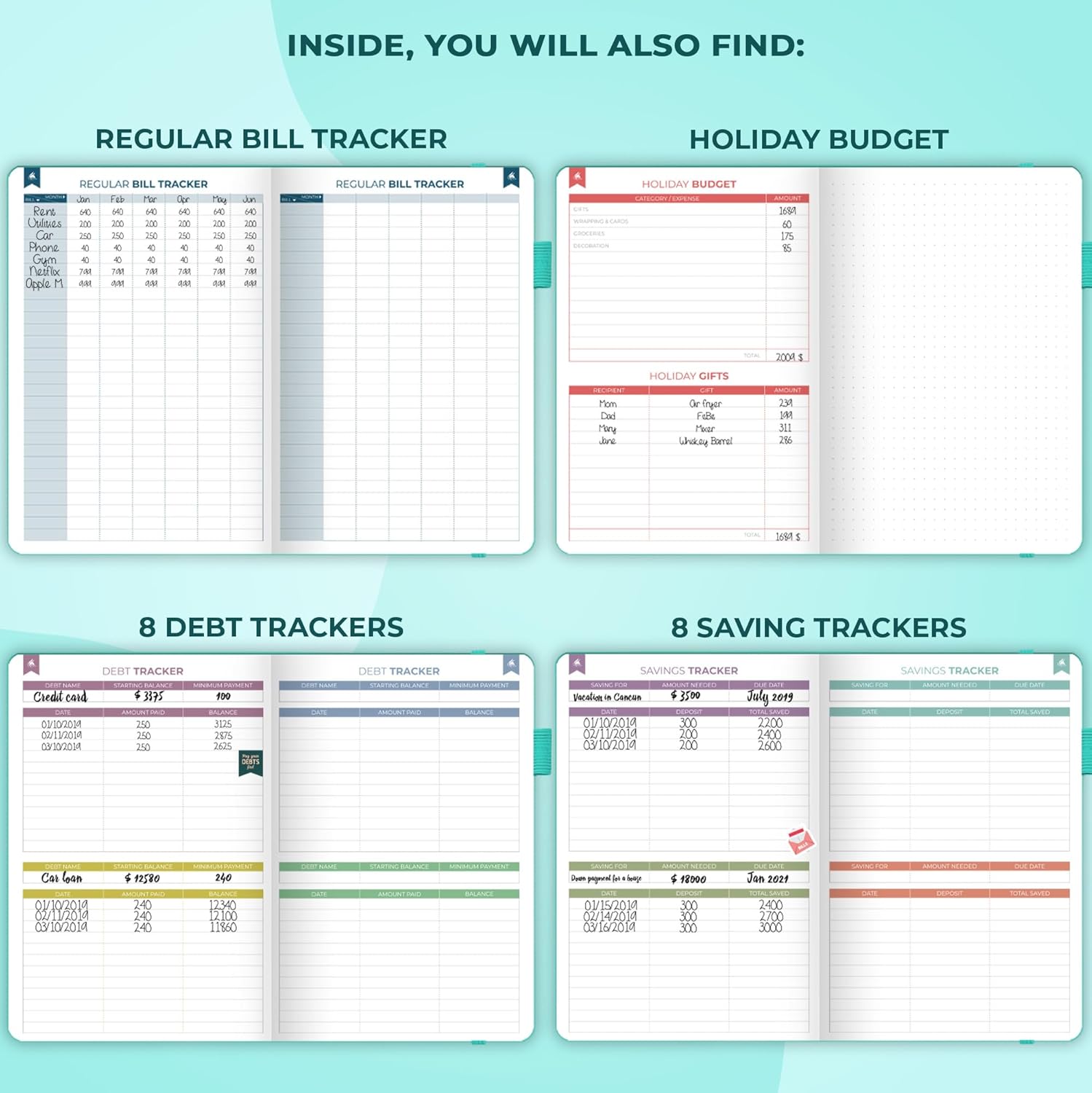 - TRACK SAVINGS, BILLS & DEBT PAYOFFS – This monthly budget planner and bill tracker notebook includes 8 saving and 8 debt trackers, and a regular bill tracker to help you track your finances in more detail.