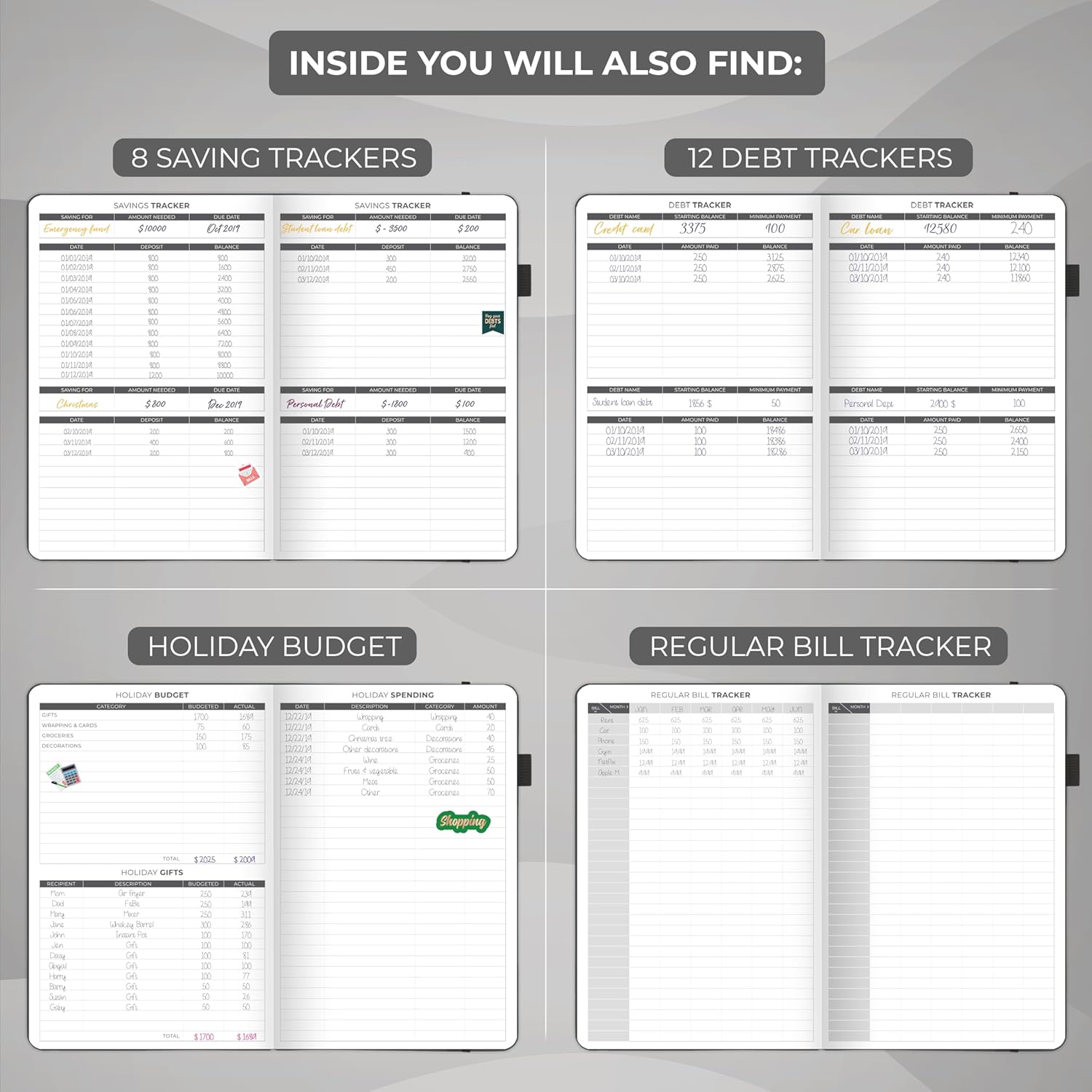 - EASILY CONTROL YOUR SPENDING, DEBTS & SAVINGS - This money planner is undated and covers 12 months. Every month features a calendar, a budget plan, and an expense tracker. The budgeting planner also includes 8 savings and 12 debt trackers.