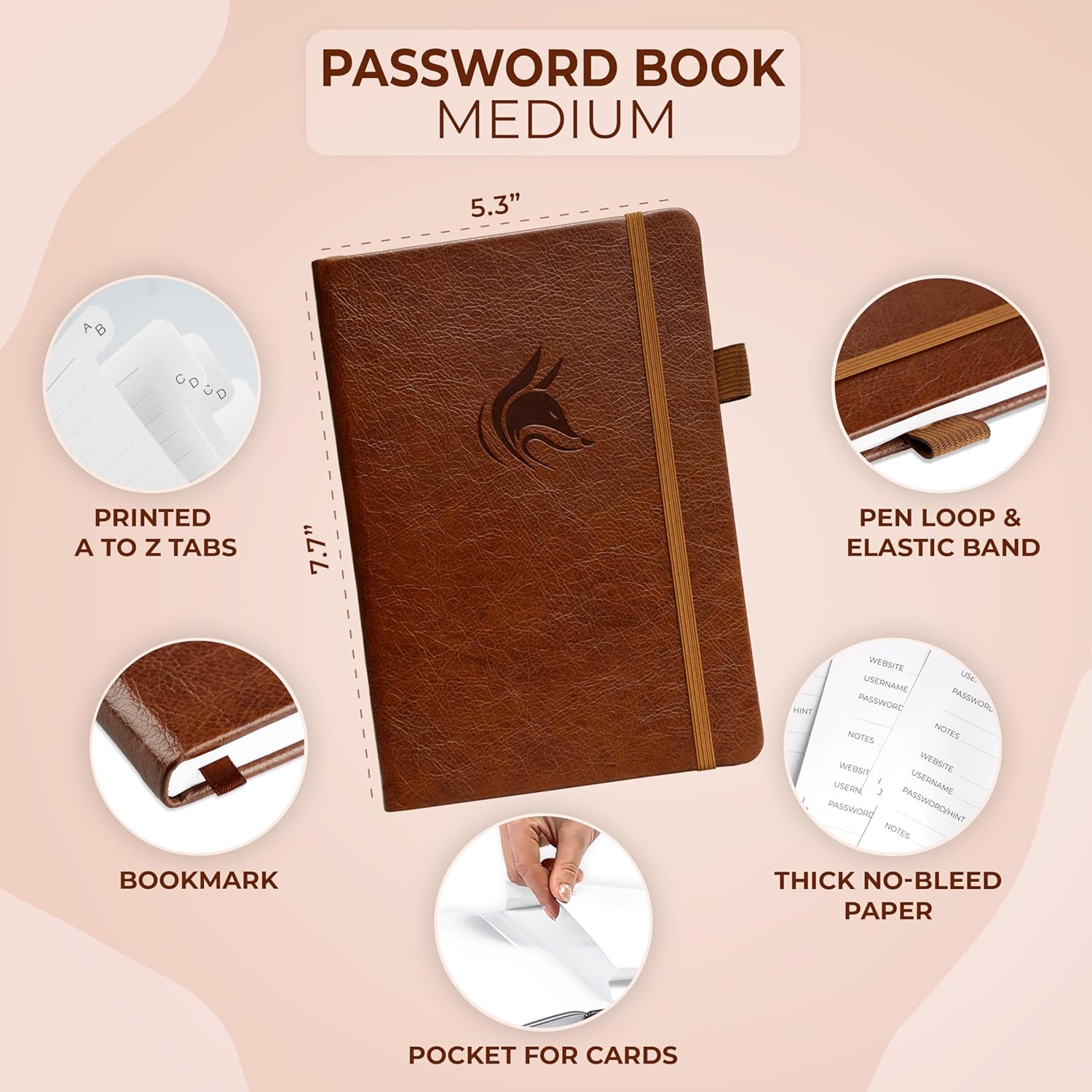 - MEDIUM SIZE & PREMIUM QUALITY - This internet address and password logbook with tabs comes in medium size (5.3x7.7 inches). The password notebook has an eco-leahter hardcover, elastic band, pen loop, bookmark, pocket for notes, and thick 120gsm paper.