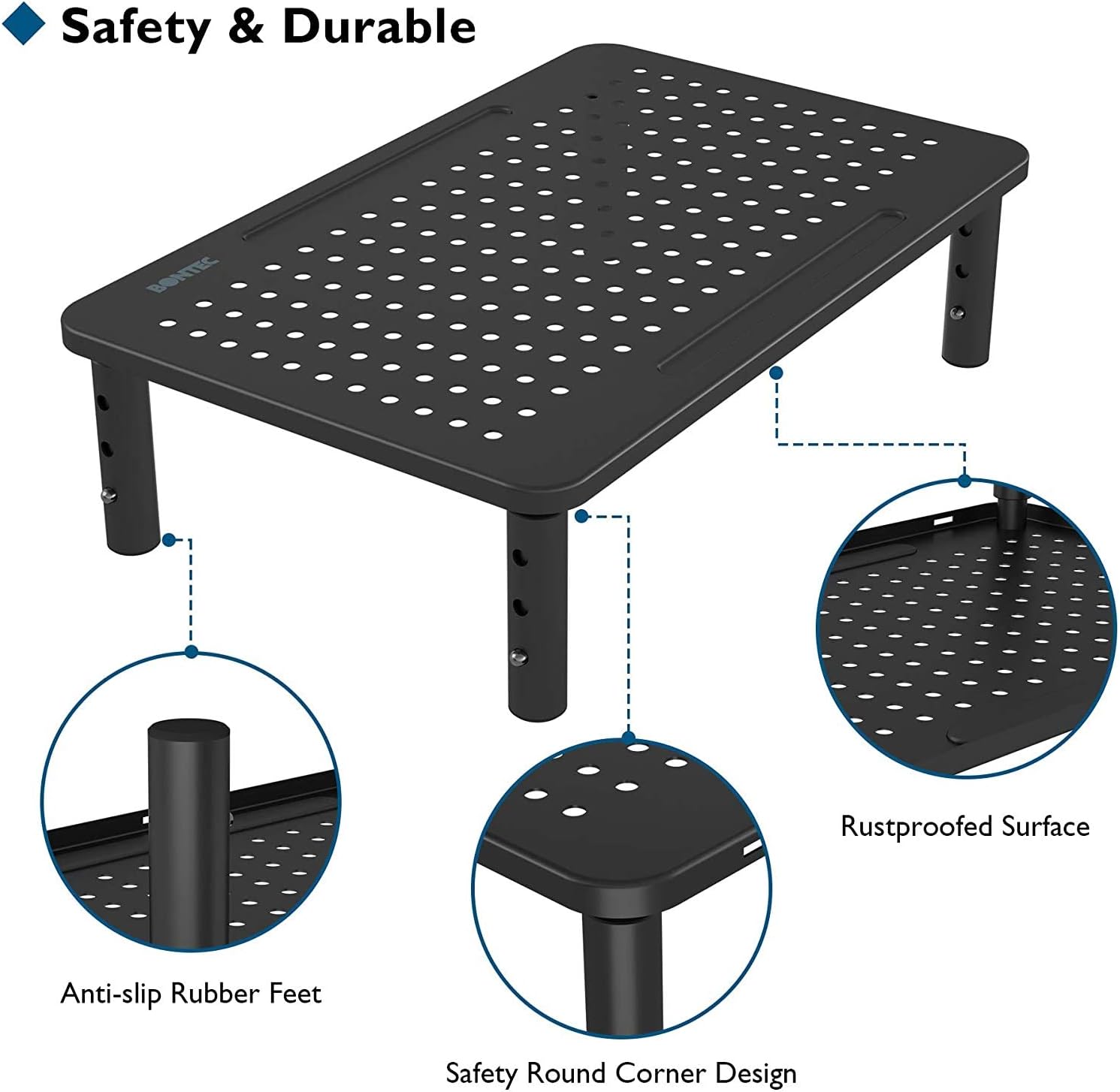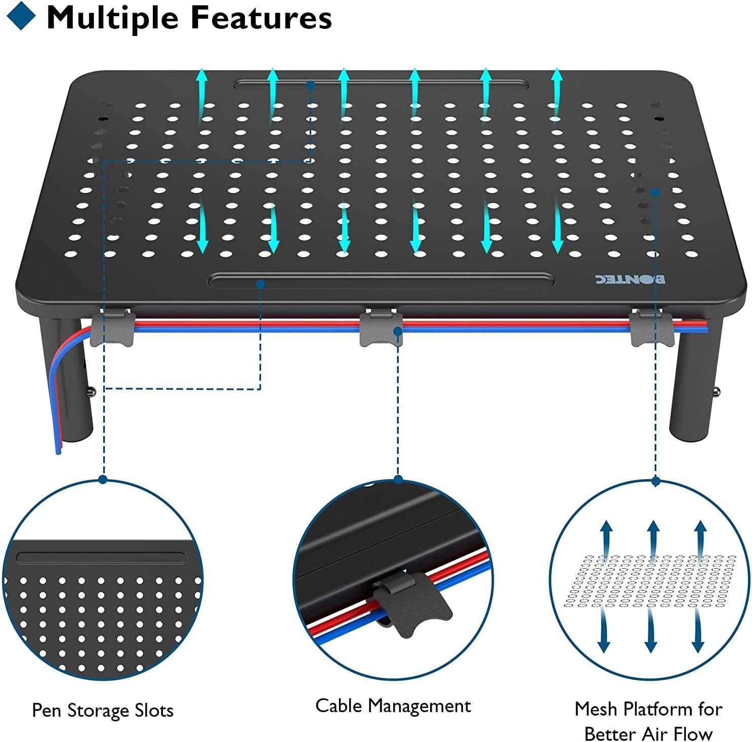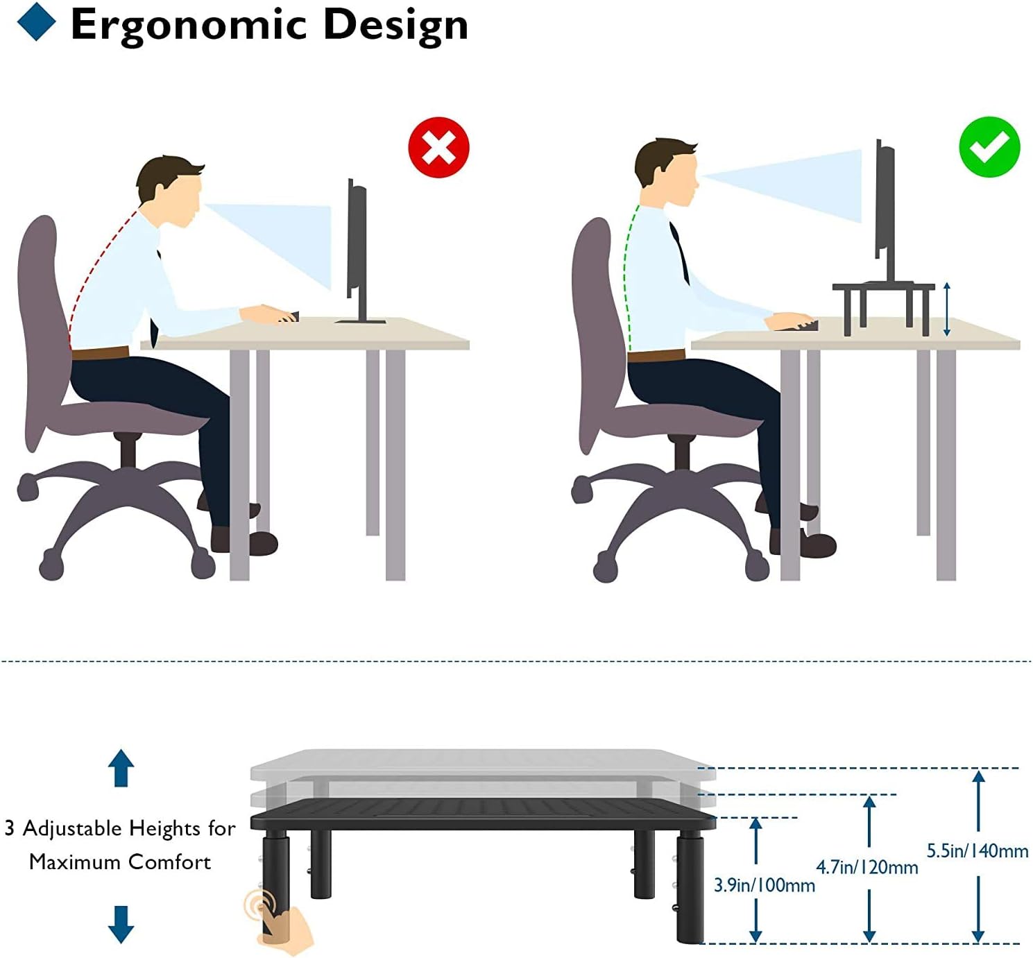 - ERGONOMIC THREE HEIGHT ADJUSTABLE DESIGN - Reduce neck and back pain by adjusting the height of your monitor stand to three comfortable levels: 3.9", 4.7", and 5.5" with one-touch press control. Perfect for improving posture and relieving eyestrain during long workdays.