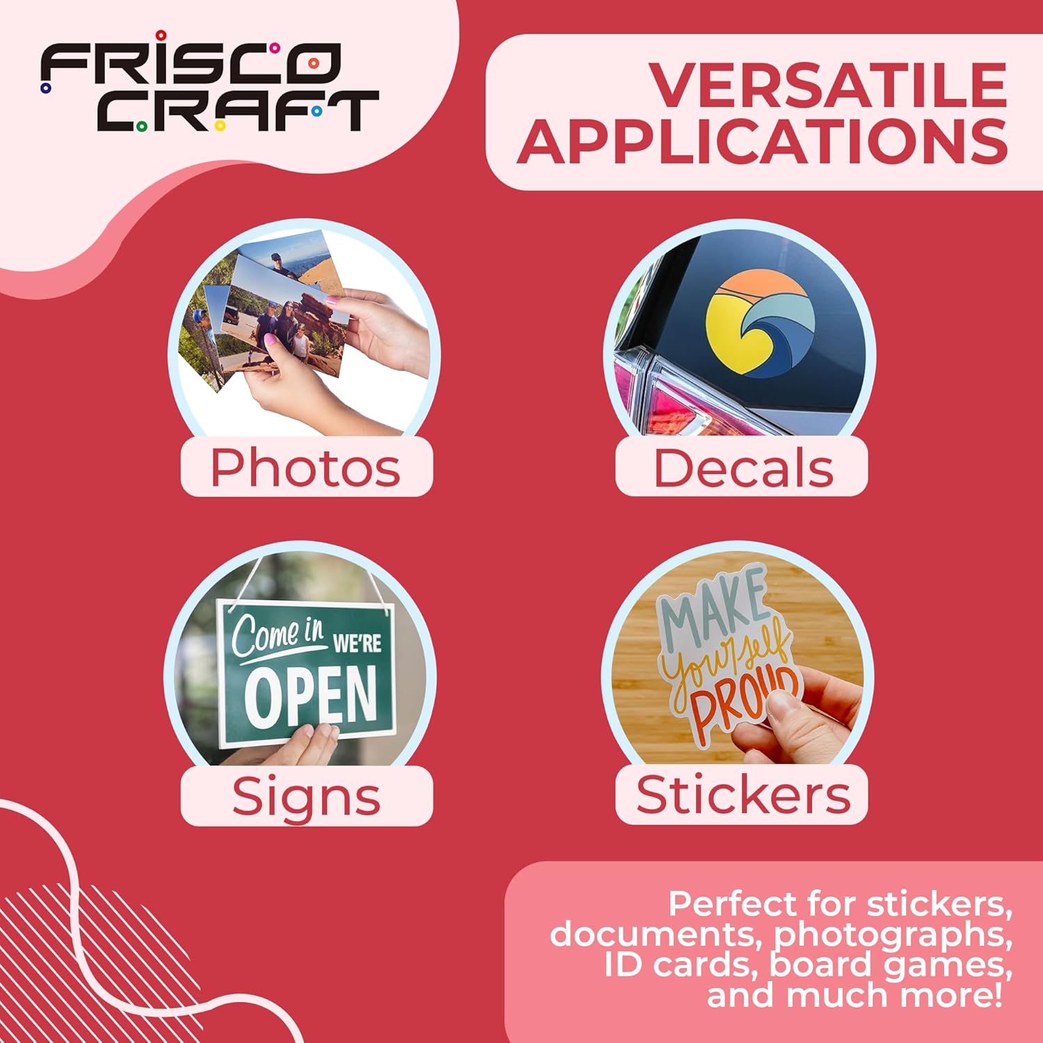 - UNLIMITED CRAFTING POSSIBILITIES: From stickers to signs, bookmarks to laptop covers, unleash your creativity with Frisco Craft's self lamination sheet. Whether you're a DIY enthusiast or a professional crafter, our versatile roll opens up a world of possibilities for your projects. Note: Packaging may vary.