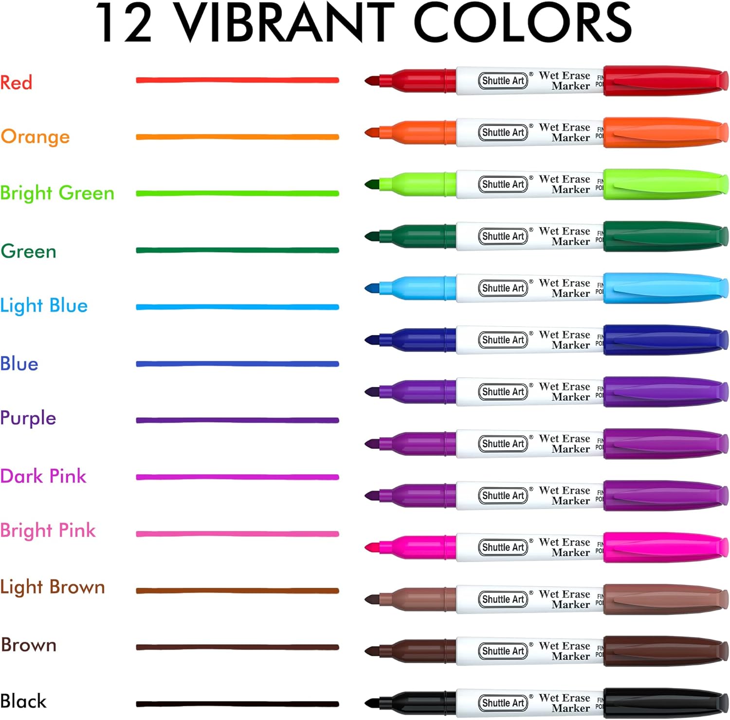 - 12 COLORS FINE TIP: This set contains 12 bright colors , all based colors are include! With 1 mm fine tip, are made of premium polyester. Shuttle Art wet erase markers allows you write notes, drawing, reminds, schedule, doodles more clear detailed and legible .