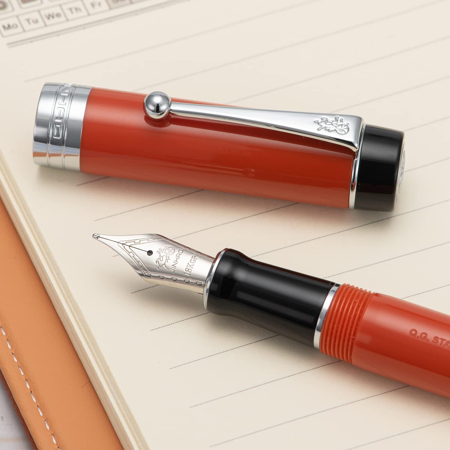 - The acrylic resin celluloid evokes a vintage aesthetic, particularly orange red marble design that appears in this pen.