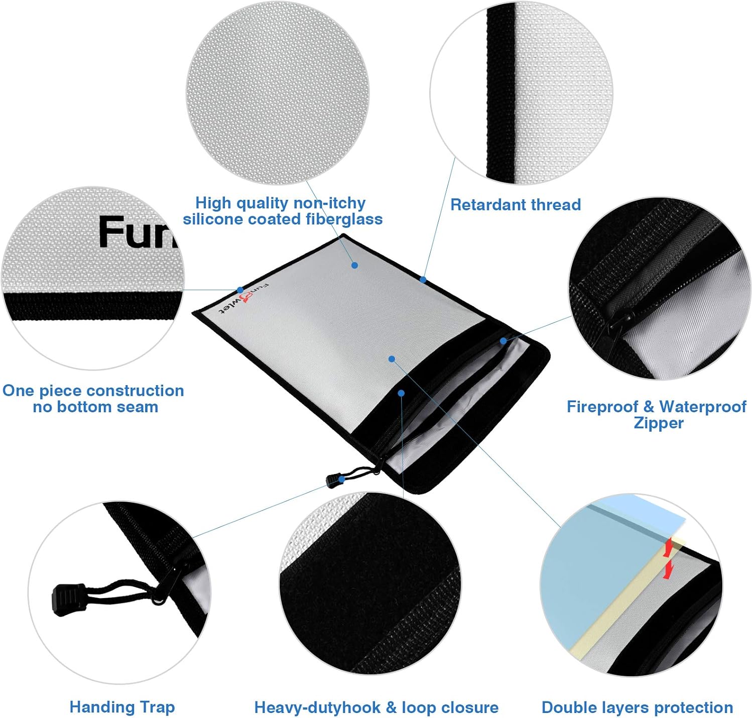 - Fire and Water Resistant: The fireproof document pouches are made from high quality, non-itchy silicone-coated fiberglass that can withstand temperatures up to 4200β. They protect your documents and valuables from fire damage and are not only fire-resistant but also highly water-resistant, safeguarding your items if they get wet. These bags are suitable for both indoor and outdoor use.