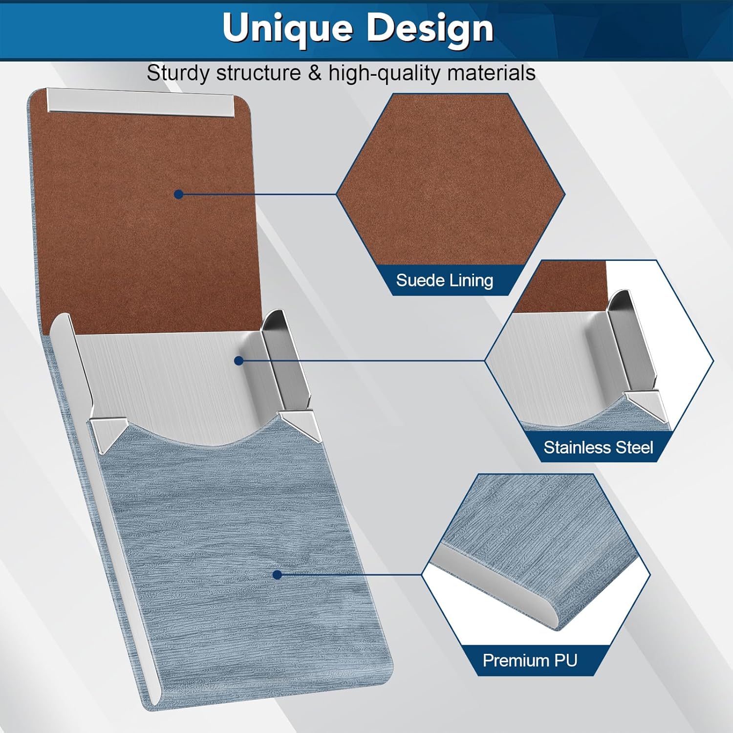 - Material: Our business card holder made of luxury PU leather and high quality Stainless Steel. It has a good solid construction, use longer.