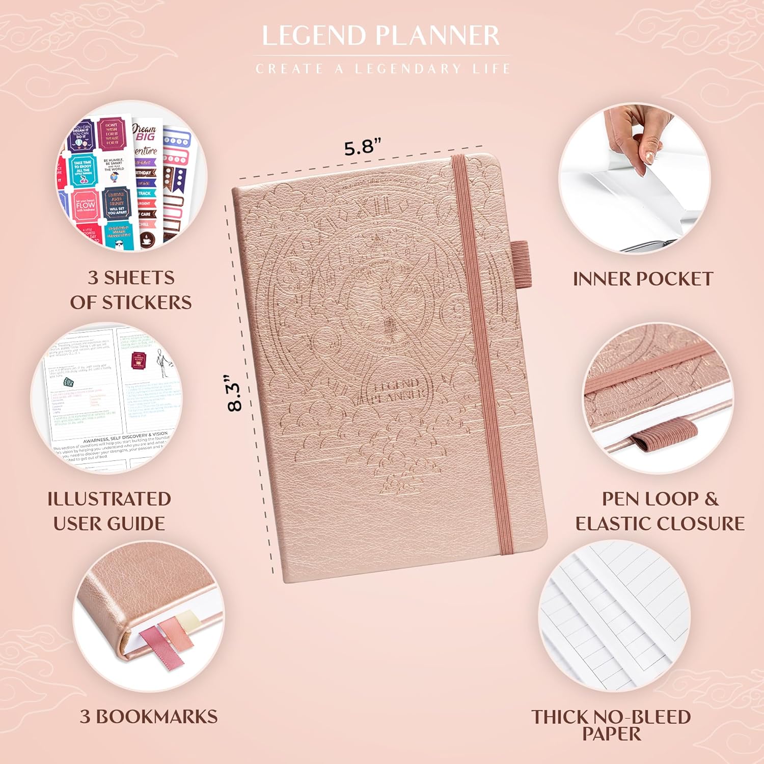 - UNDATED PAGES, A5 FORMAT & STICKERS – This daily planner measures 5.8 x 8.3 inches, has undated pages, eco-leather hardcover, thick 120gsm paper, lay-flat binding, pen loop, elastic, 3 bookmarks, planning stickers, and user guide.