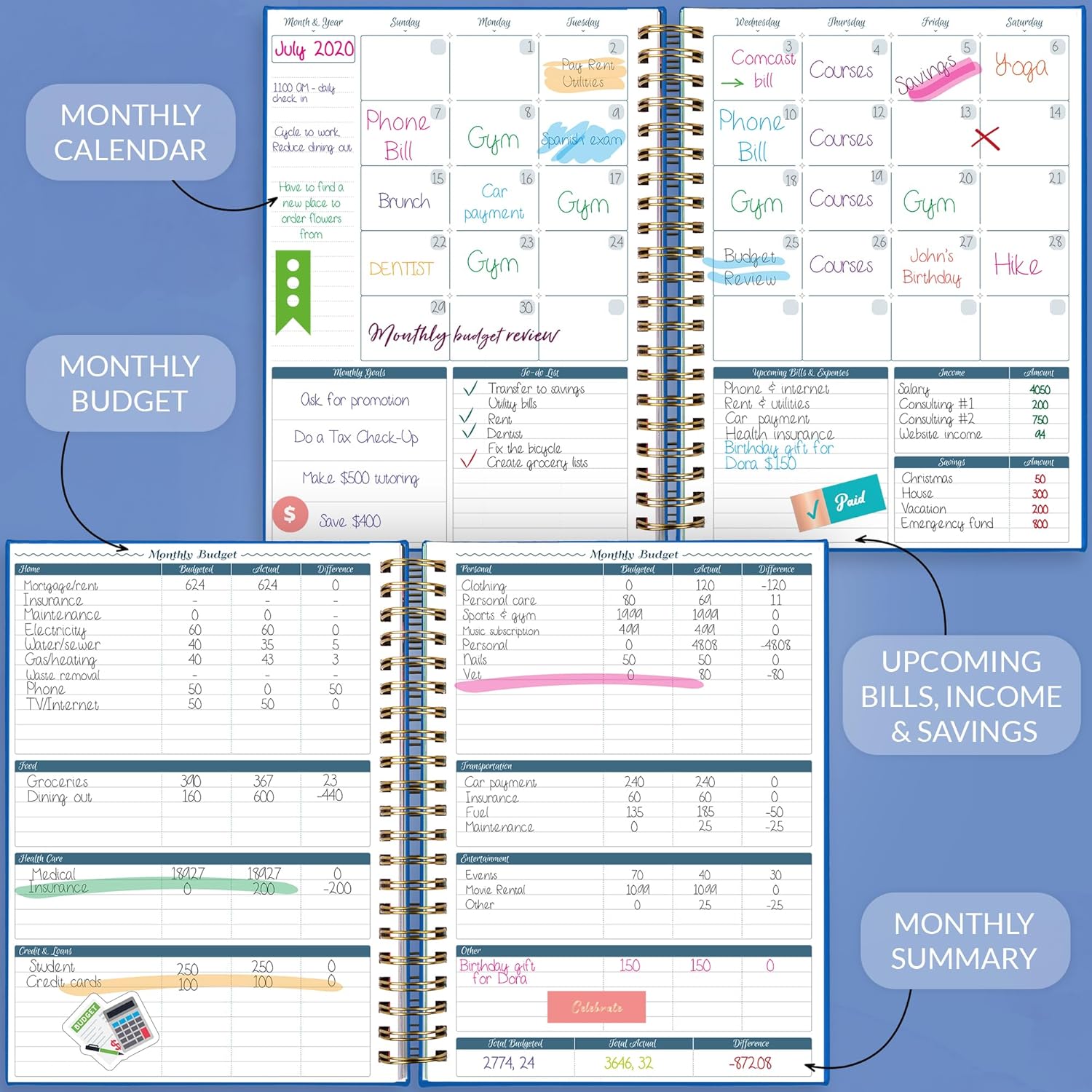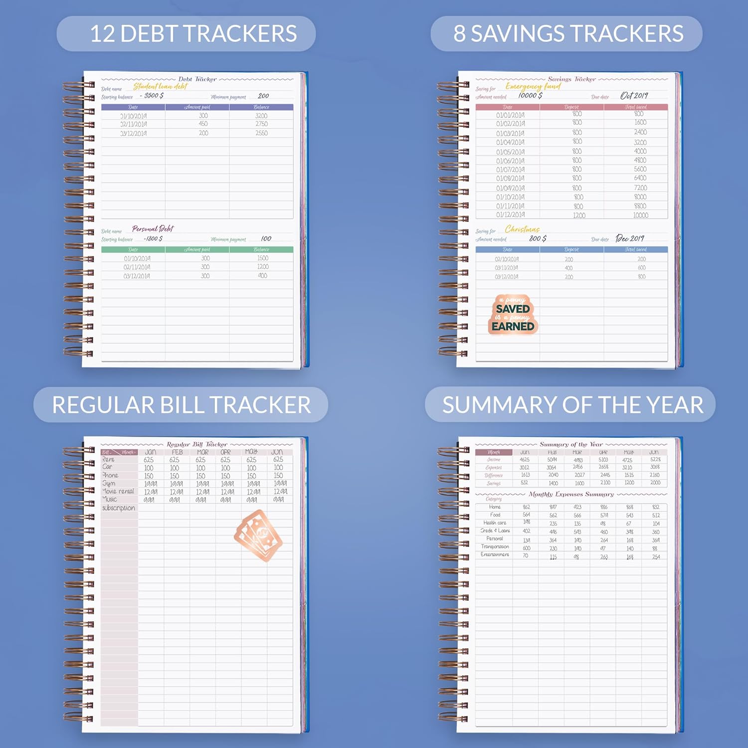 - ALL YOU MAY NEED FOR BUDGETING: This budget planner organizer helps you set financial goals, develop a strategy and incorporate it into your monthly budget. At the back, you will find 4 savings tracker, 6 debt tracker, holiday budget, and a bill tracker.