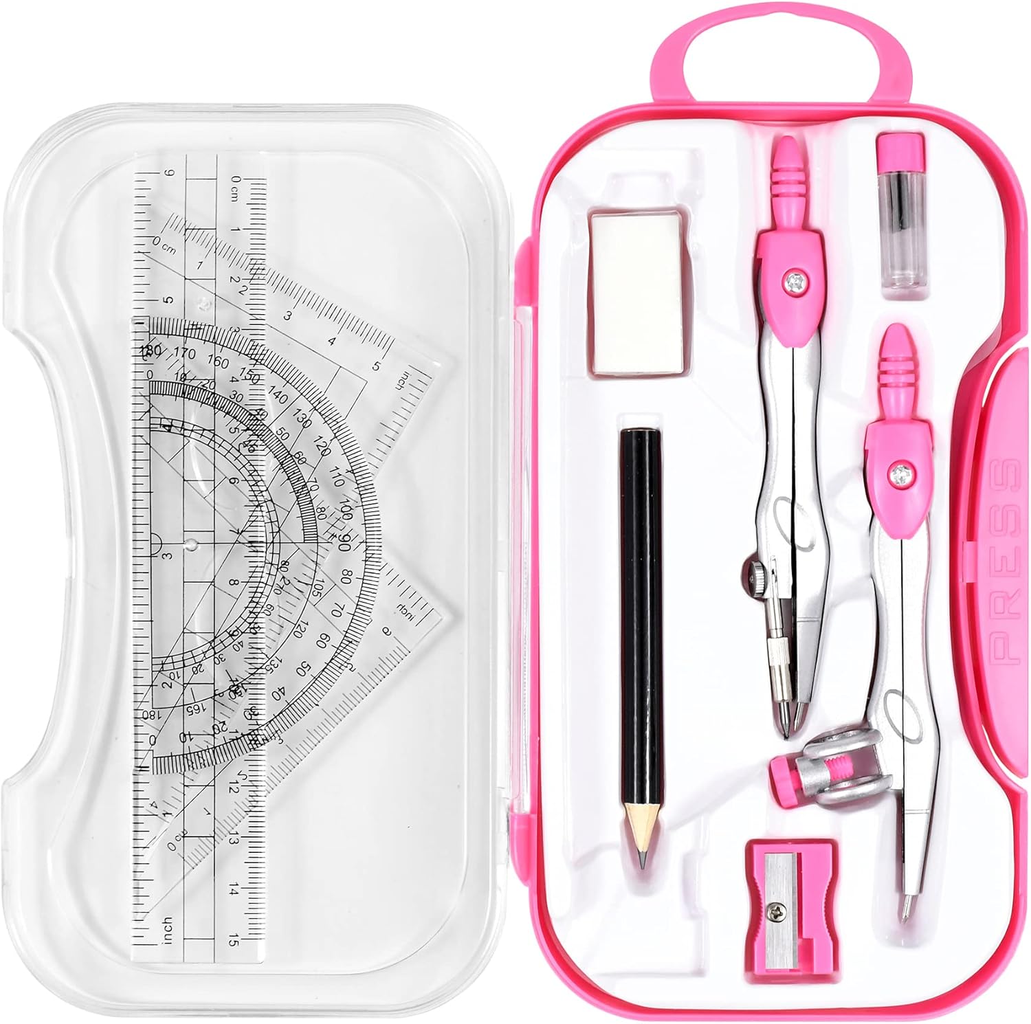 Math Geometry Kit Sets 10 Piece Student Supplies with Shatterproof Storage Box,Includes Rulers,Protractor,Compass,Eraser,Pencil Sharpener,Lead Refills,Pencil,for Drafting and Drawings(Pink)