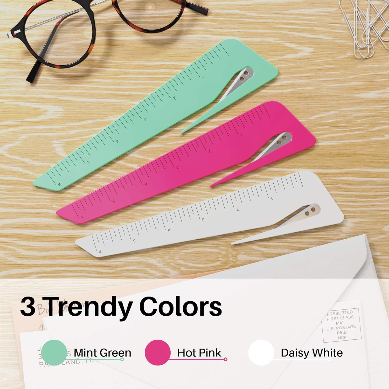 - Trendy and Functional: The small ruler & envelope openers come in 3 trendy colors, mint green, and pink. No need for other measuring tools. Measure accurately with the pocket sized precision scale ruler with metric centimeters and inches, and open mail in a breeze.