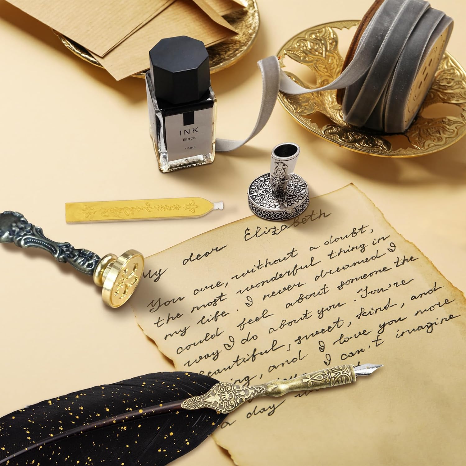 - QUILL AND INK SET Includes large feather quill, Calligraphy nibs, Antique Pen holder, black ink wells in a gift box. Calligraphy set for beginners is not only great for writing but also a perfect antique desk decor.