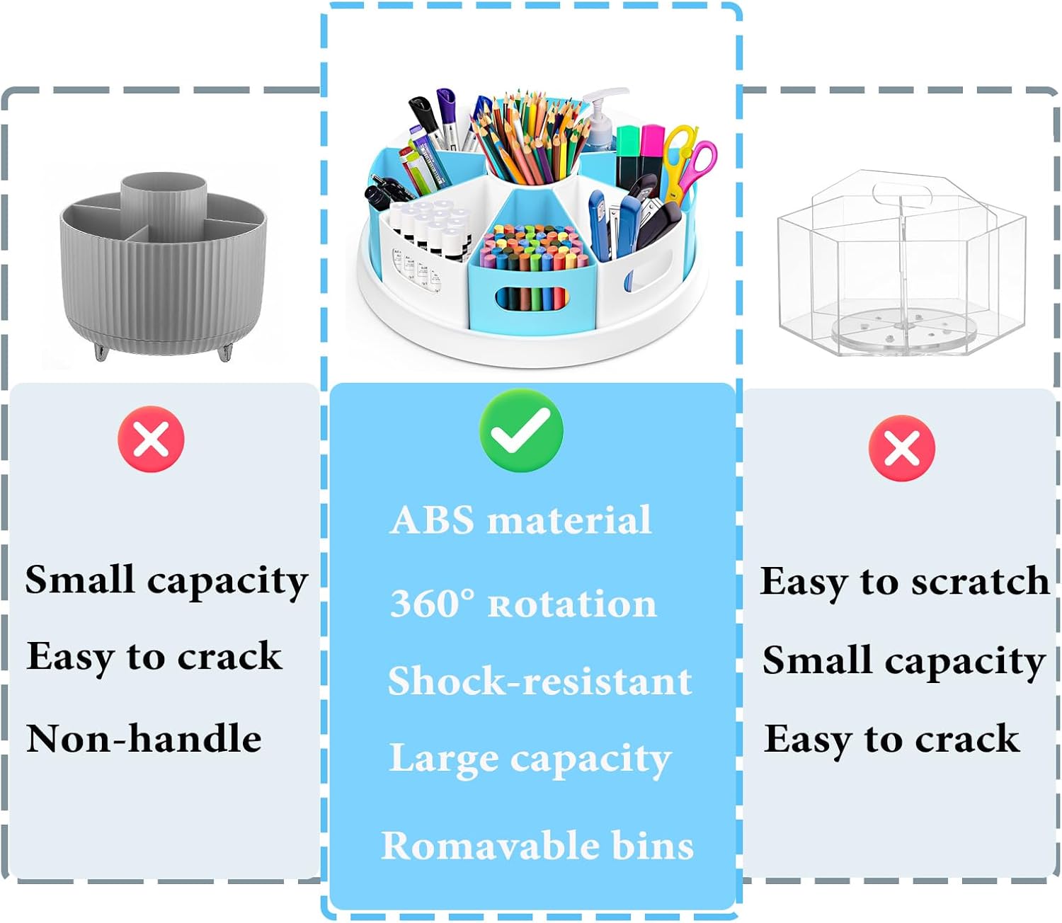 - MULTIPURPOSE LAZY SUSAN STYLE ORGANIZER! Forget boring storage trays, our Rotating desk organizers is truly multipurpose with 9 deep bins, a super smooth 12” turntable & great colors – perfect for serving snacks, office and school supplies, organizing makeup & transforming messy desktops into mess free order!