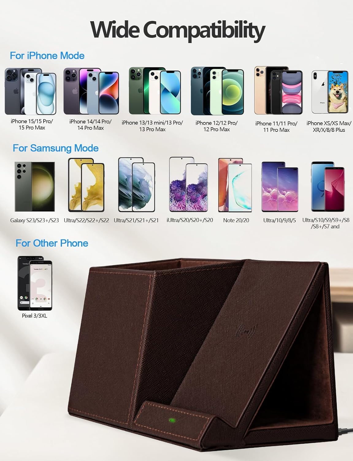 - āāā Universal Compatibility of Wireless Charger: 7.5W fast charging for iPhone 17/16/15/14/14 Plus/14 Pro/14 Pro Max/13/13 Pro/13 Mini/13 Pro Max/12/SE 2020/11/XS/XR/X/8; 10W fast charging compatible for Samsung galaxy S24/S23 Ultra /S23/ S23+/S22 Ultra / S22 / S22+ / S21 Ultra /S21+ / S21/ S20 Ultra / S20/Note 10/S10/S10E and So on; (Note: Adapter is NOT Included)