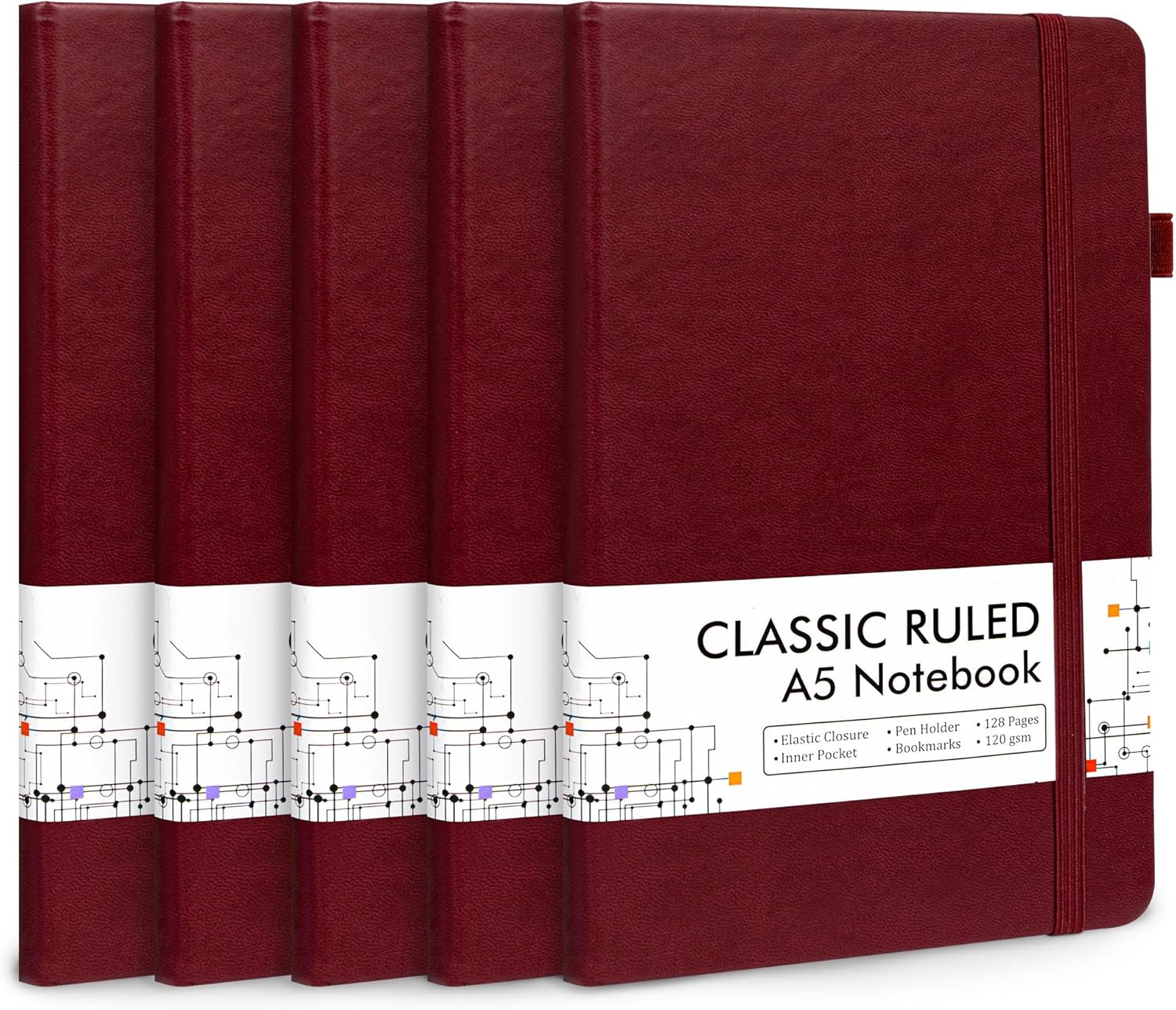 - Feela 5 Pack Classic Ruled Notebooks contains 5 classic wine ruled sturdy cover notebooks and 5 Black Retractable Pens. Each of the notebooks measures 8.3” x 5.1”, which is perfect to carry and easily held by young girls and boys. These black cute pens are customized to be placed in the pen holder, which is pretty convenient.