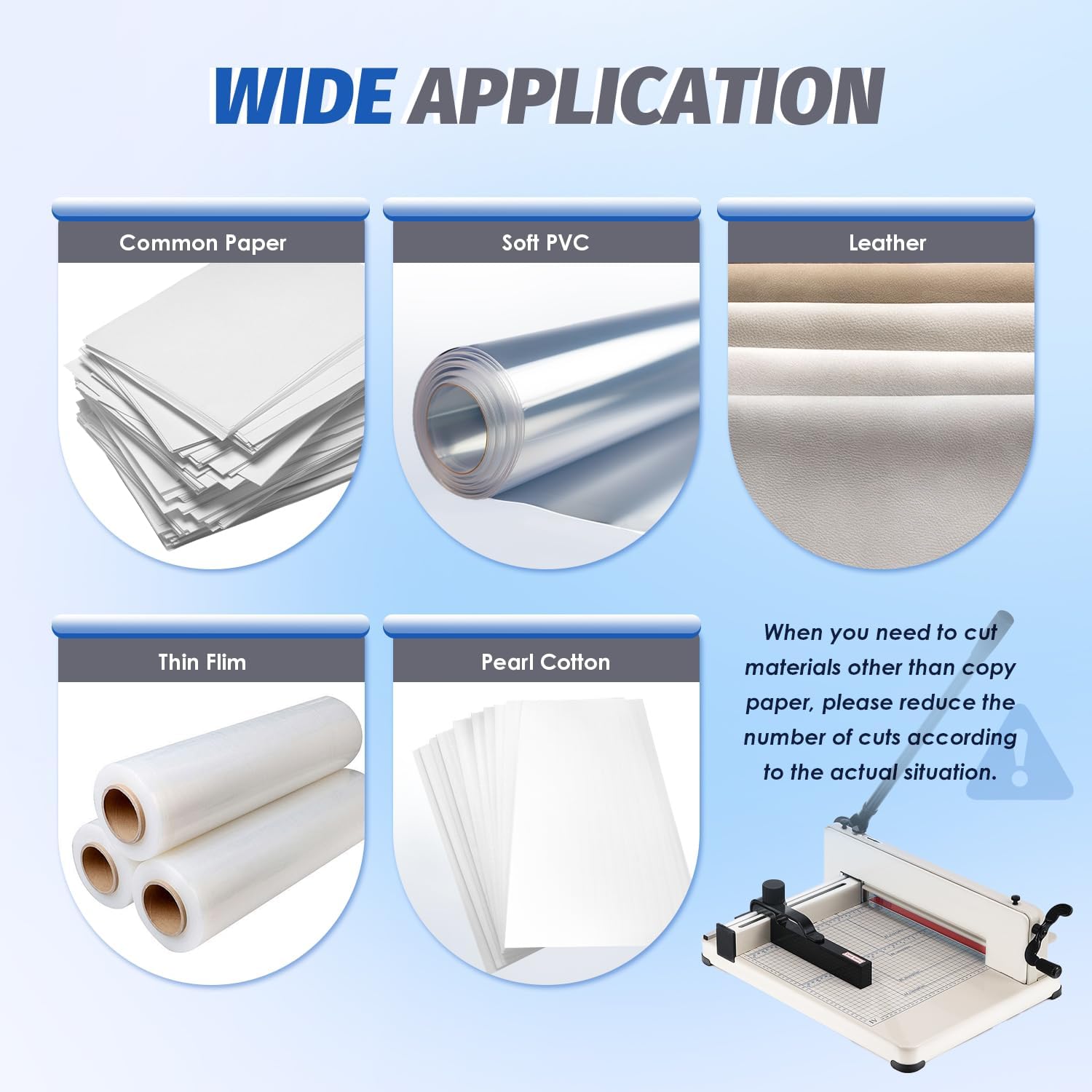 - Wide Application: It is suitable for people who deal with hundreds of sheets of paper, and besides of paper, it can also cut soft PVC, leather, non-woven fabric, bubble film, fabric pearl cotton and etc, is a very powerful paper cutter.