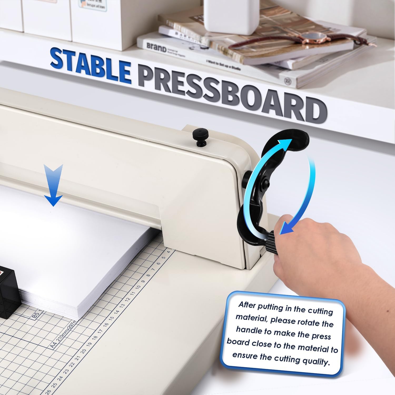 - Accurate Cutting: The built-in press clamp can put even pressure on the cuting line by rotaring handle on the side, minimizing the paper shift and drag to ensure the cutting accuracy and straightness. But honestly, it cannot cut 100% down the line, there was always a slight shift during a cut, 5% error. NOTE: when you recceive the machine, the press handle is assembled backward for better transport.