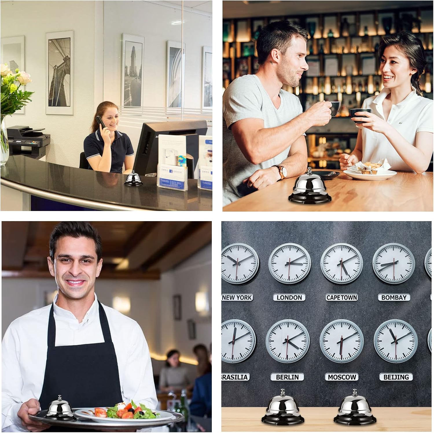 - Metal Call Bell: Bells featutre a metal construction, a mirror effect chrome polished finish dome, and a matte black non-slip base, anti-rust, beautiful, sturdy and durable; Silver color make it looks modern and professional