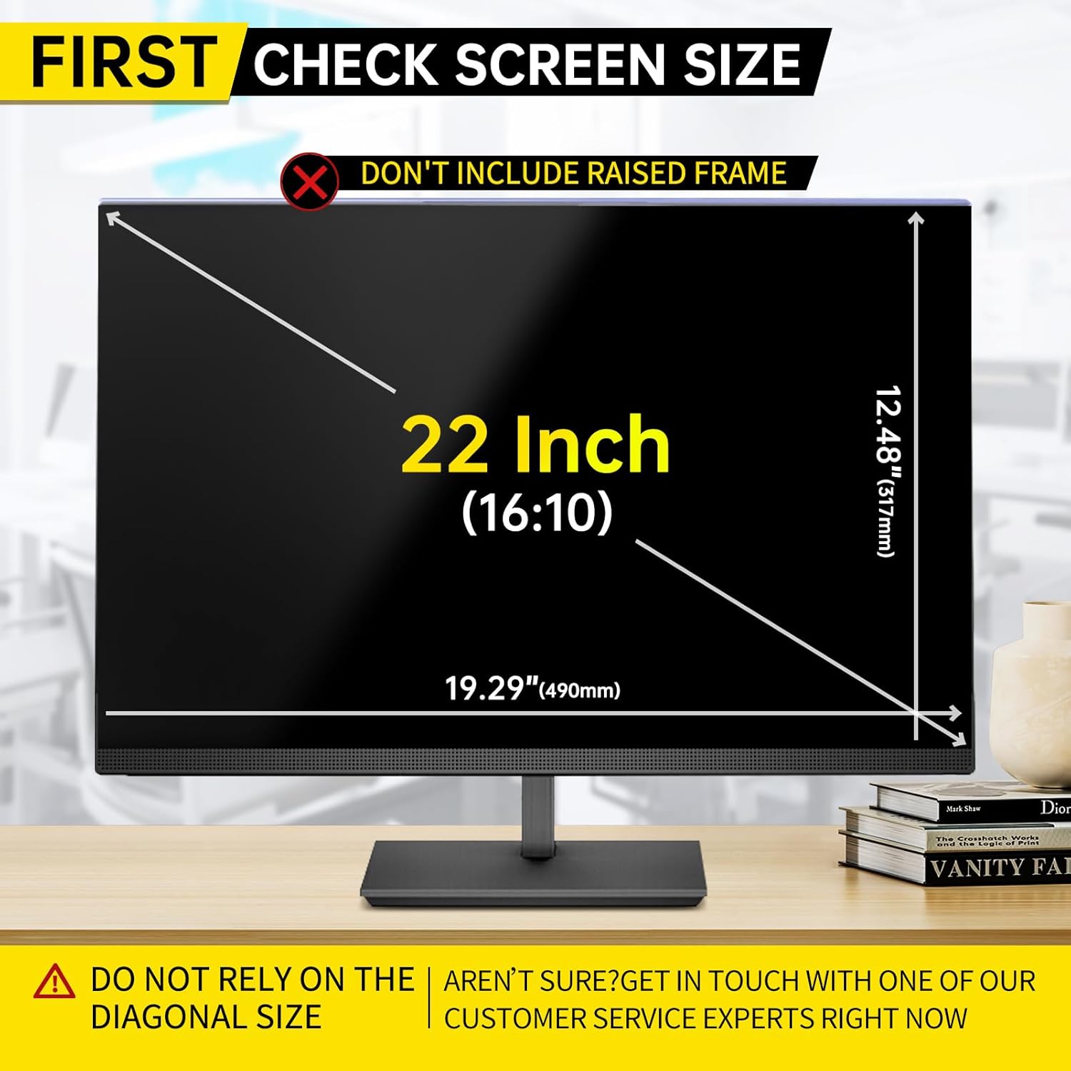 - 【 Privacy Filter Dimensions 】This privacy screen for computer monitor fits for 22" widescreen monitors with a 16:10 aspect ratio. Actual Filter Size: Width: 19.3'' (490 mm), Height:12.5'' (317 mm), Diagonal: 22" (558.8 mm). Please verify your computer screen's width and height measurements before ordering. It's not recommended to make your selection based solely on your computer screen's diagonal size.