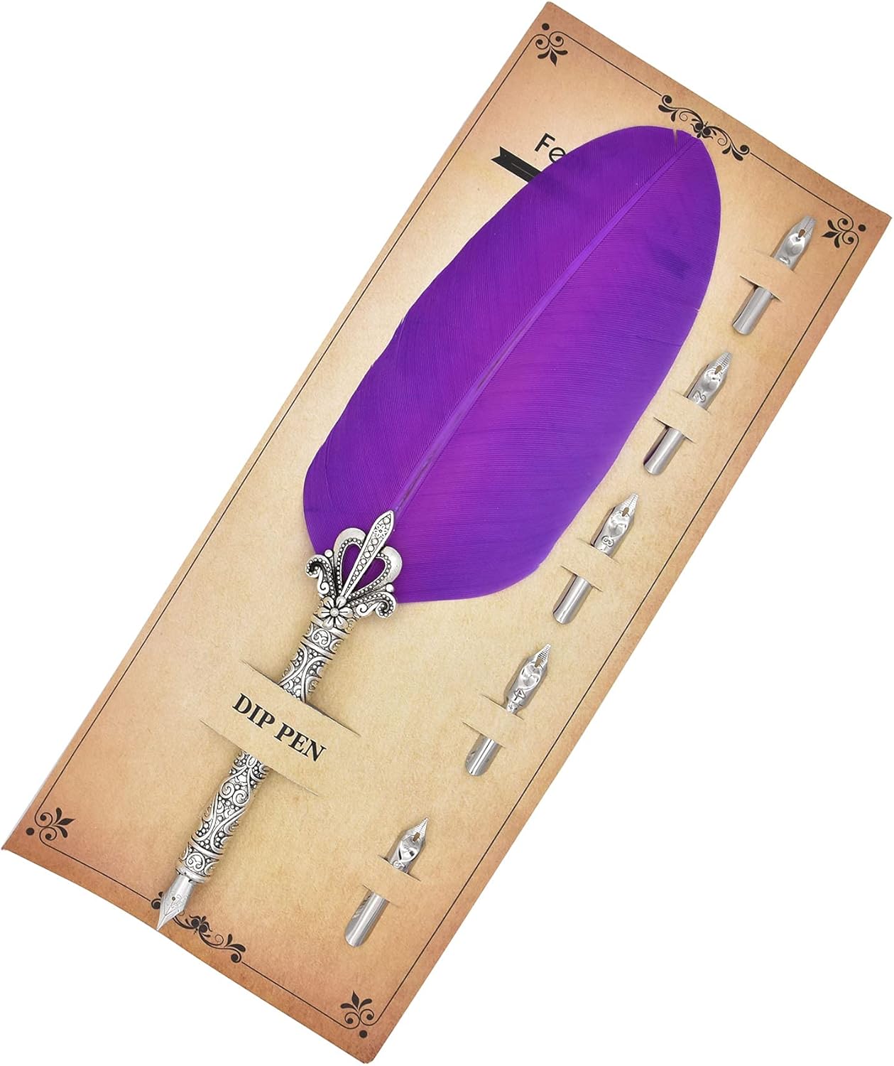 Gullor Feather Quill Pen and 5 Calligraphy Nibs for Beginners Kids Calligraphy Writing Quill Dip Pen Set, LightPurple