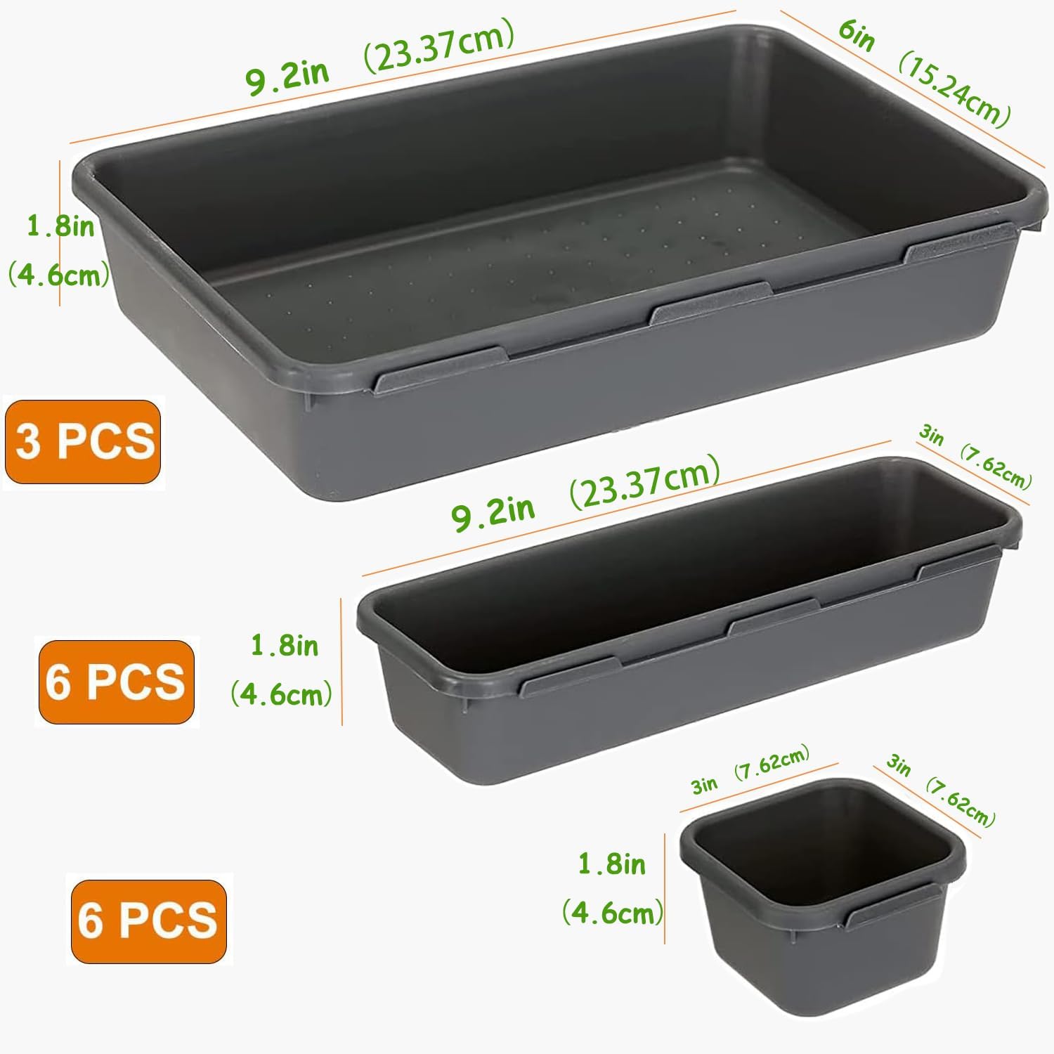 - 【STACKABLE】The organizer trays can be stacked together when not use, or each one works alone.Set includes:3 Pack *( 9.2 L x 6 W x 1.8 H in), 6 Pack* ( 9.2 L x 3 W x 1.8 H in), 6 Pack* ( 3 L x 3 W x 1.8 H in)
