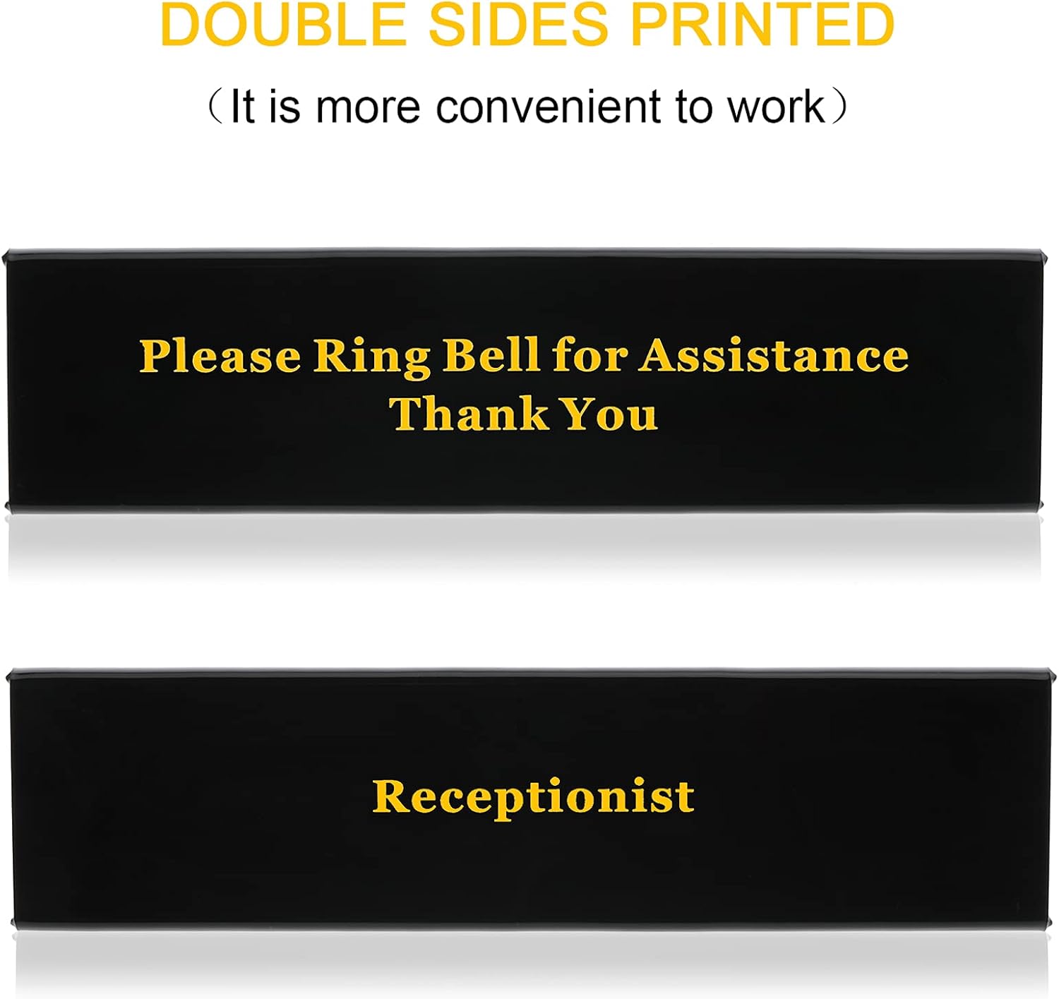 - Desk sign: the front design sign is made of acrylic, printed clearly on both sides, one side is "Please Ring Bell for Assistance Thank You", the other side is "Receptionist", good tool for dining table or conference room