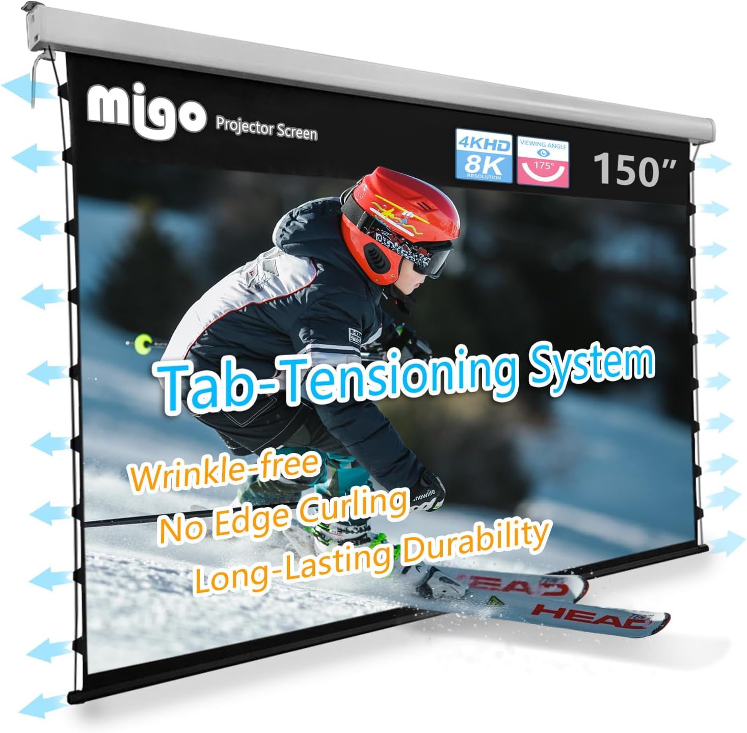 - [All Scene Installation] MIGO motorized projector screen specially designed for most U.S.homes, ensures easy setup in various environments.The 150 inch projector screen supports 5 installation methods, including wooden or concrete ceiling and wall mounts