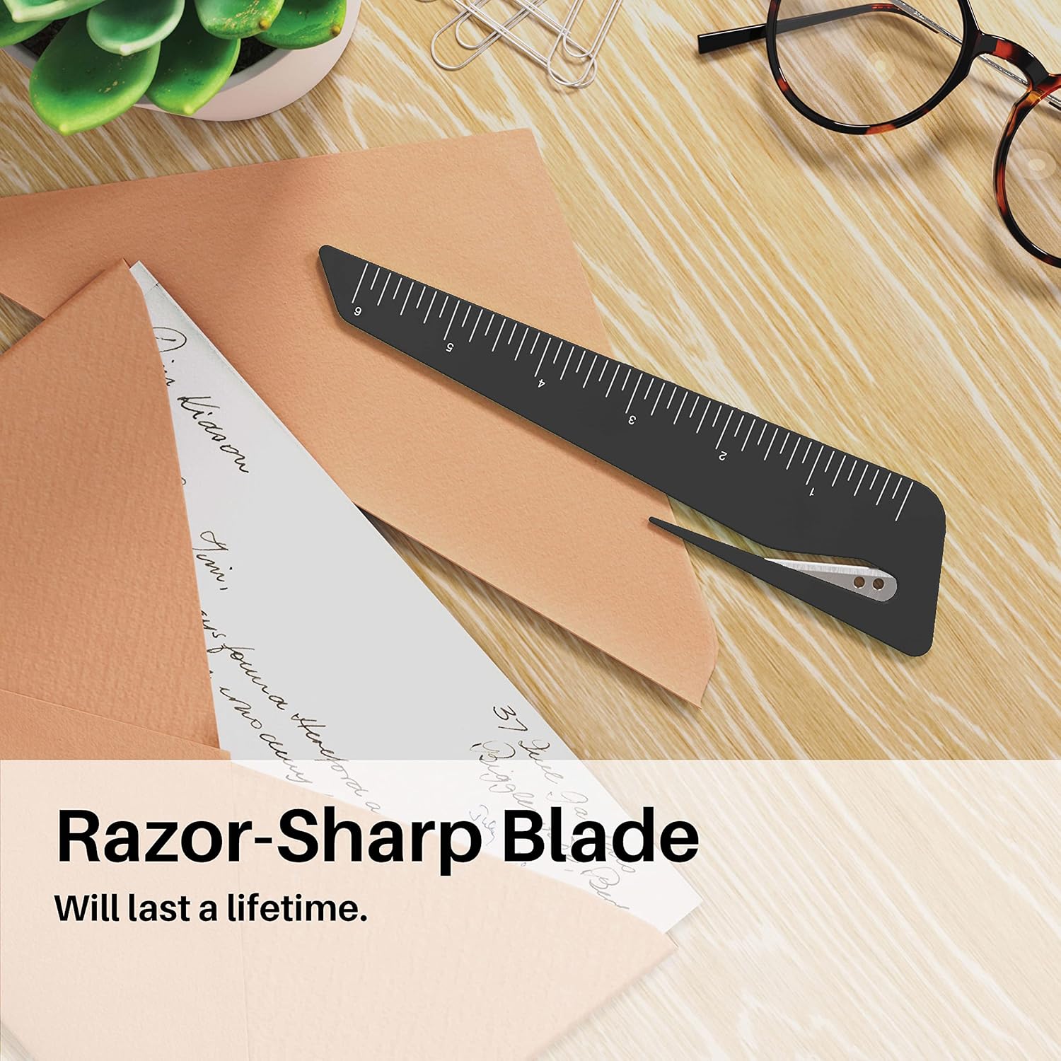 - Safety: Our blade is sharp enough to cut through paper and may cause harm if handled improperly. Please keep the small ruler/envelope slitter out of the reach of young children and handle with care.